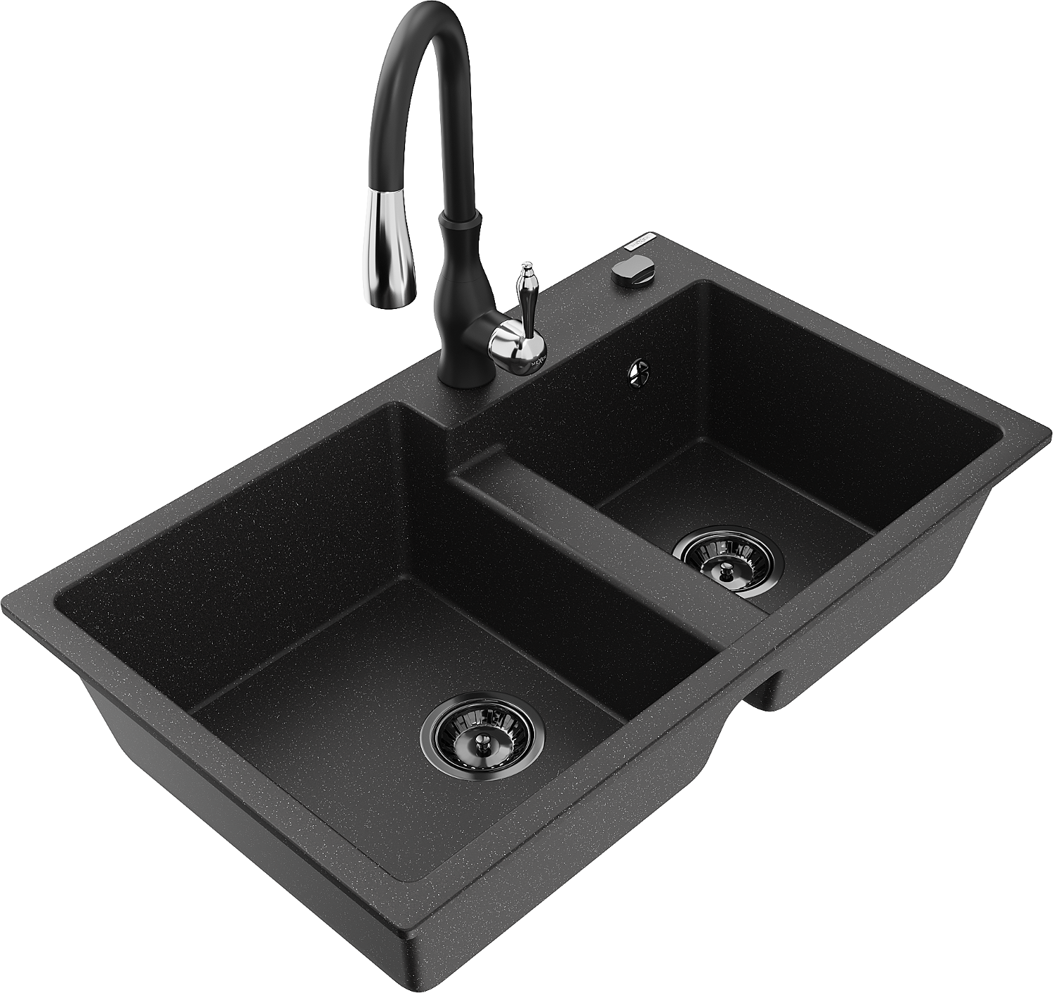 Mexen Tomas гранитна кухненска мивка с 2 отделения с кухненски смесител Savita, черен/сребрист металик - 6516-73-672601-70-B