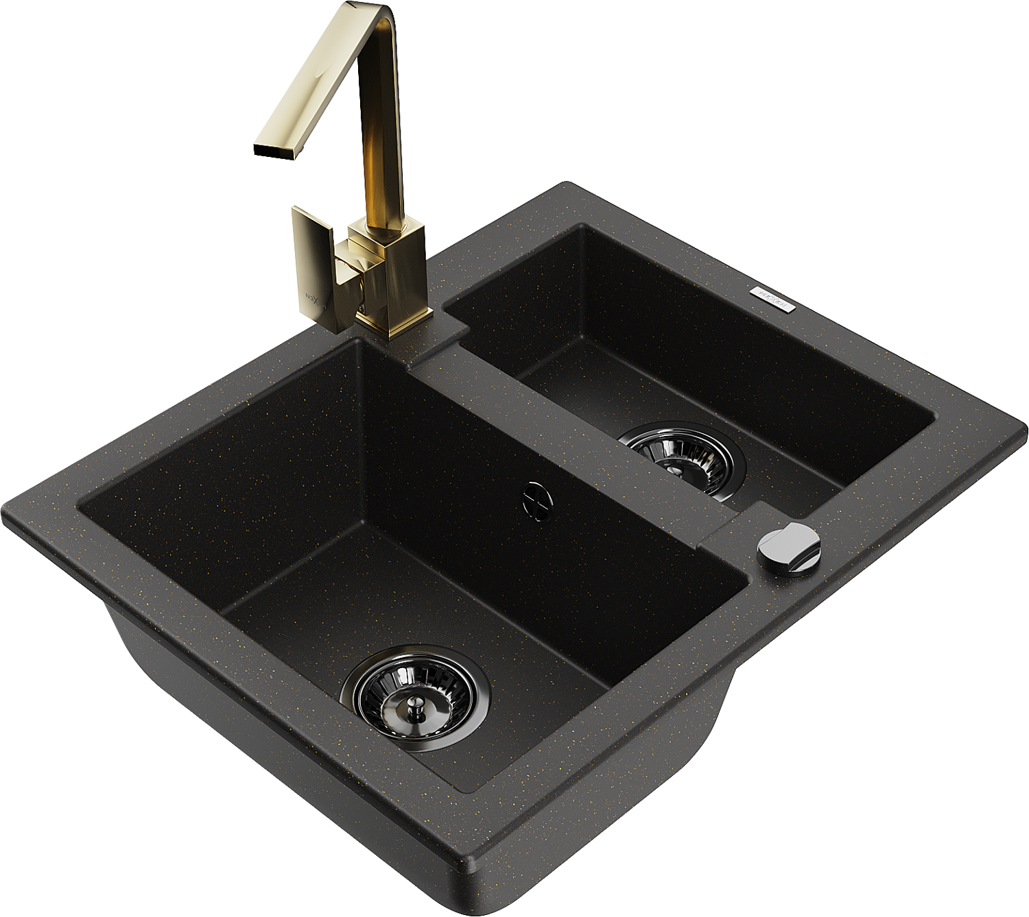 Mexen Carlos гранитна мивка 1,5-камерна с кухненски смесител Rita, черен/златен металик - 6518-75-670300-50-B