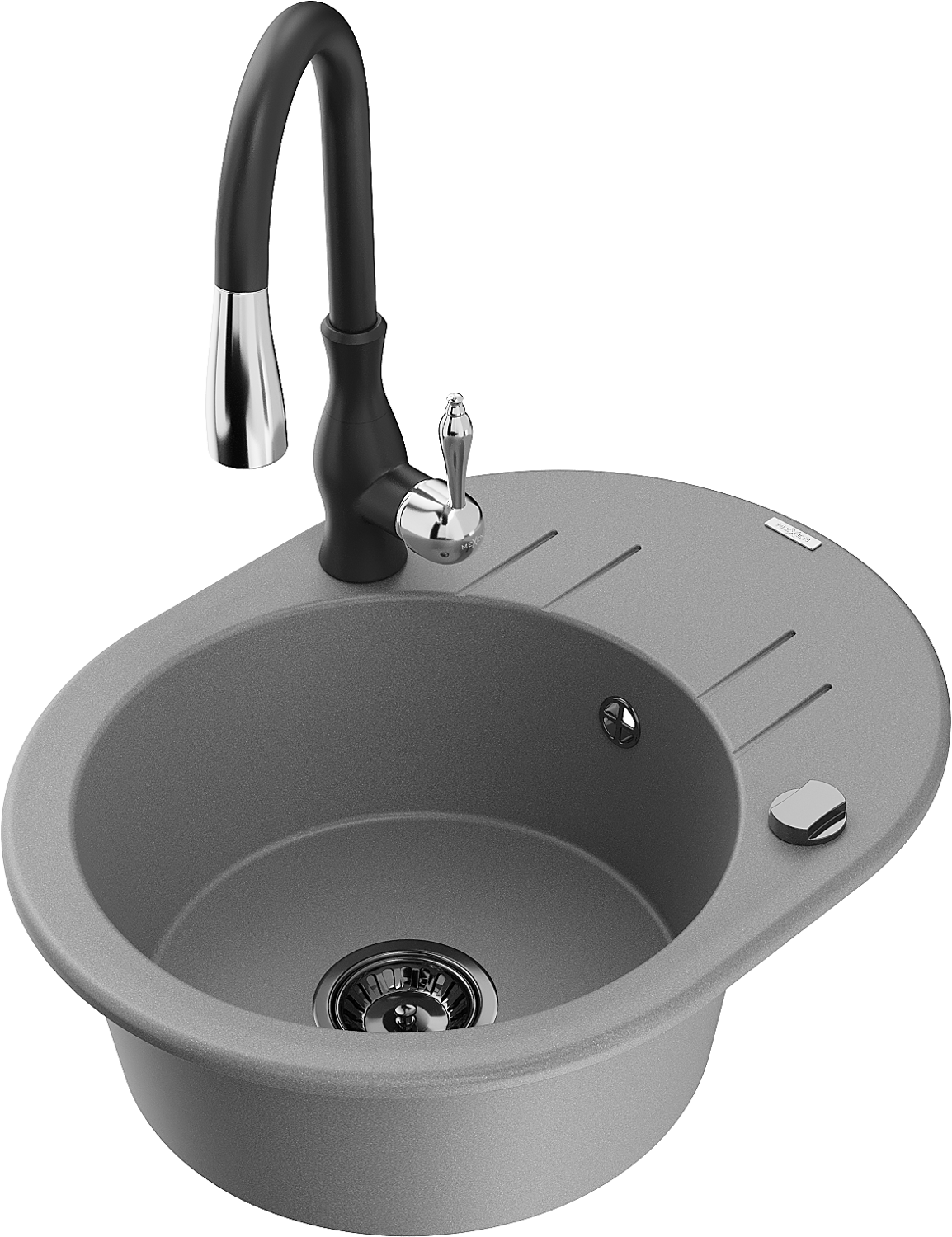 Mexen Kevin гранитна кухненска мивка с една камера с отцедник и кухненски смесител Savita, сив - 6517-71-672601-70-B