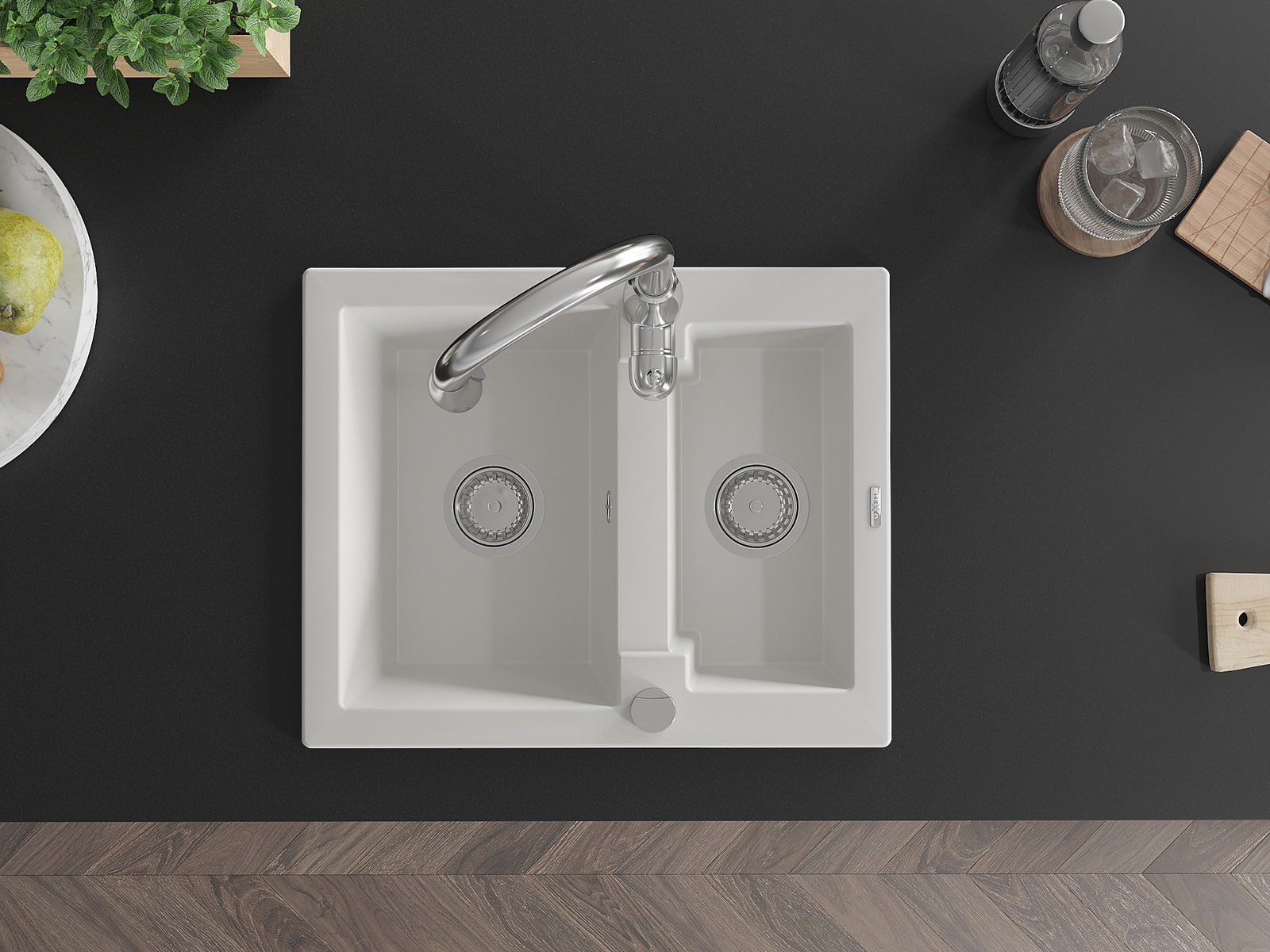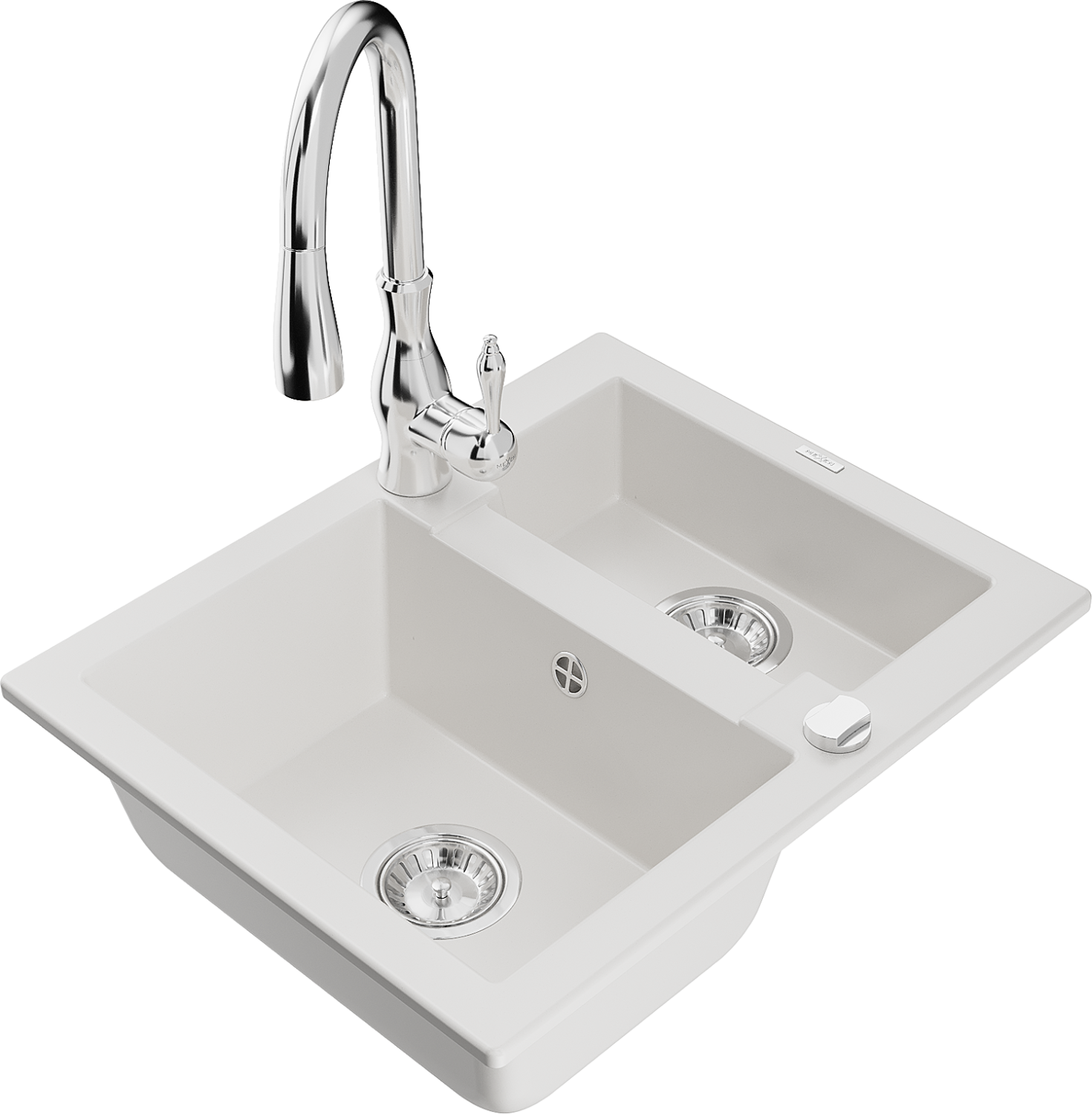 Mexen Carlos гранитна мивка 1,5-камерна с кухненски смесител Savita, бял - 6518-20-672601-00