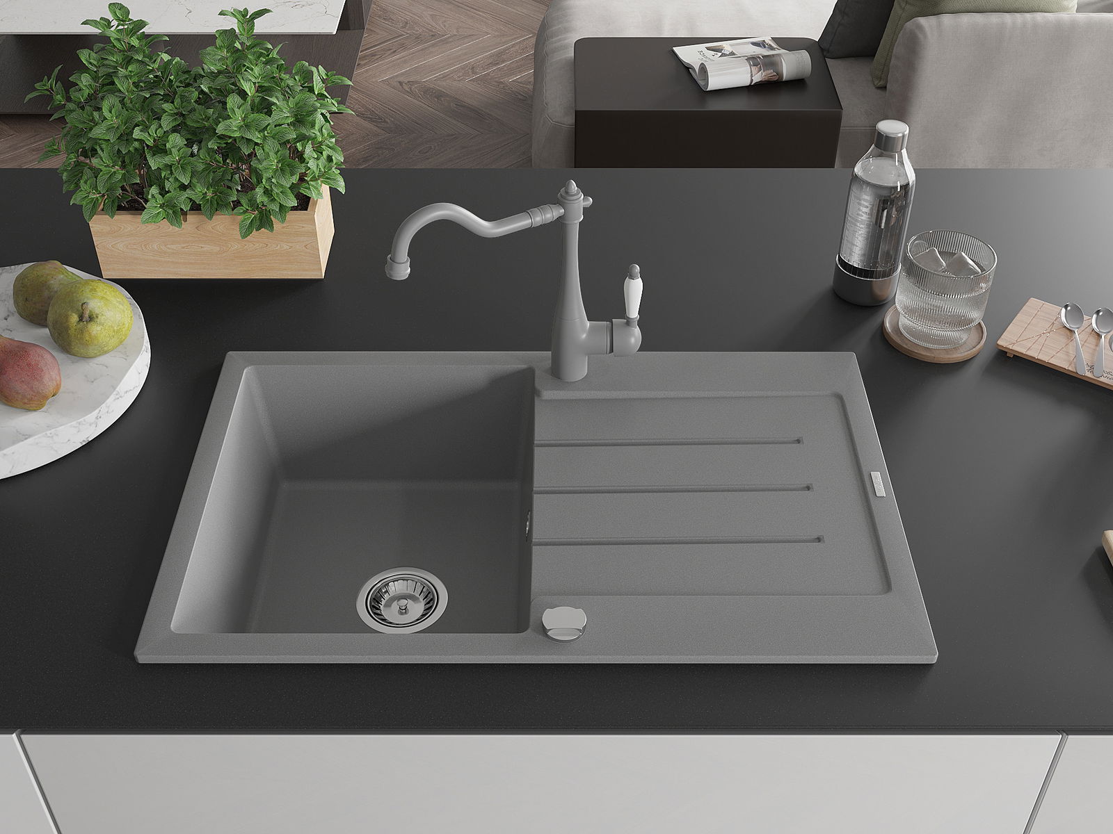 Мивката е направена от висококачествен гранит. Това е елегантно и най -вече практично допълнение към всяка кухня, независимо от нейния стил. Висококачествената и гранитна издръжливост осигуряват много години употреба.