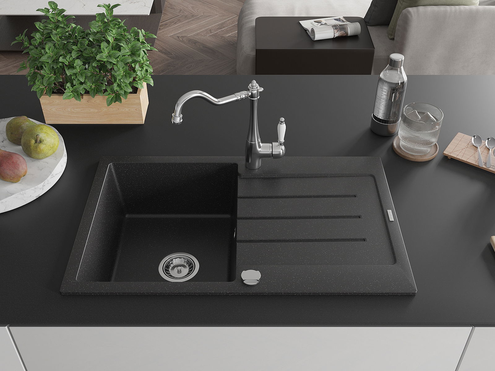 Мивката е направена от висококачествен гранит. Това е елегантно и най -вече практично допълнение към всяка кухня, независимо от нейния стил. Висококачествената и гранитна издръжливост осигуряват много години употреба.