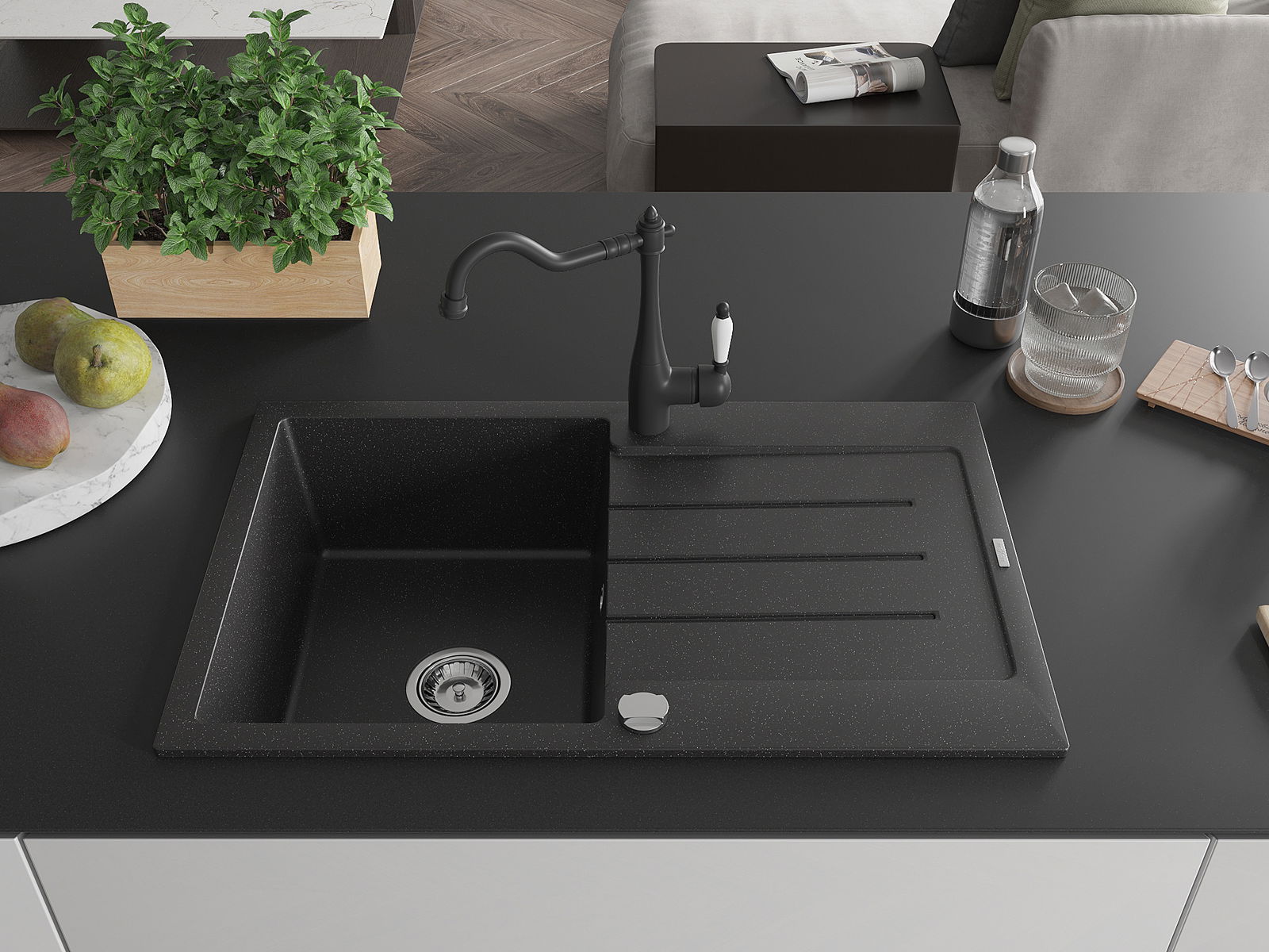 Мивката е направена от висококачествен гранит. Това е елегантно и най -вече практично допълнение към всяка кухня, независимо от нейния стил. Висококачествената и гранитна издръжливост осигуряват много години употреба.