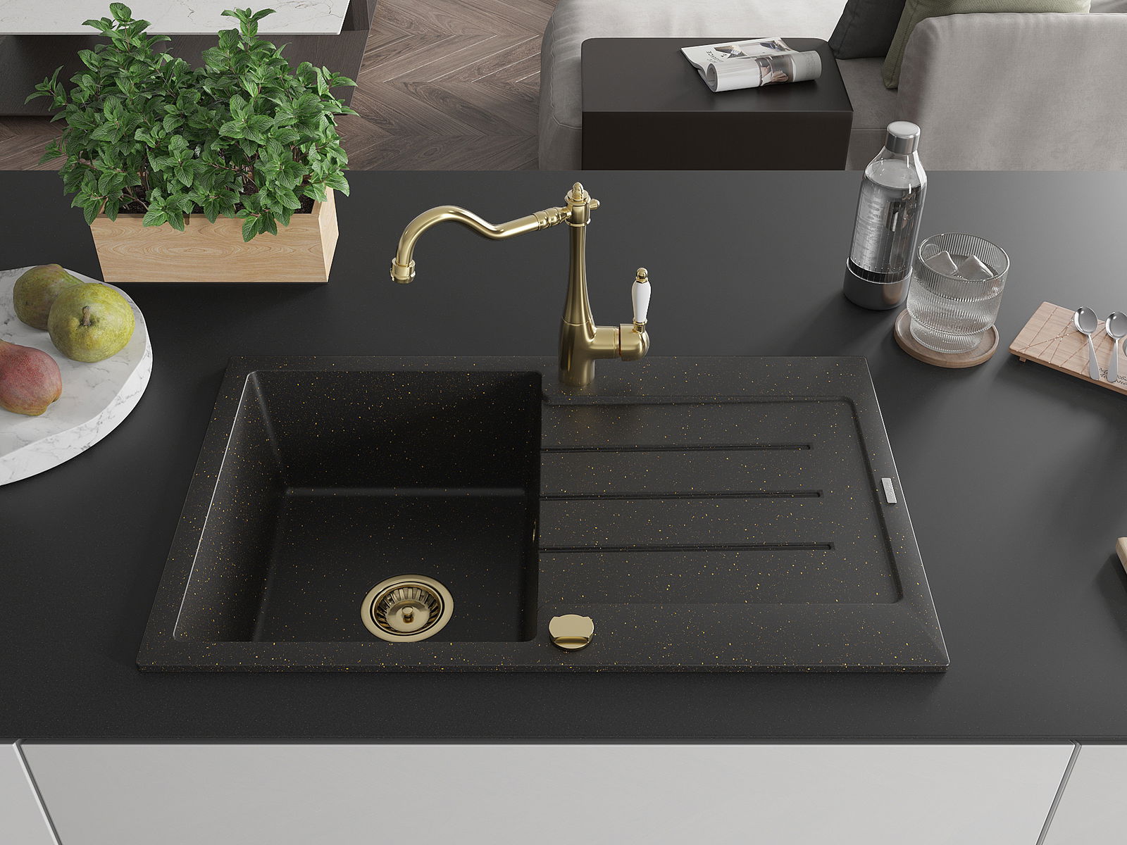 Мивката е направена от висококачествен гранит. Това е елегантно и най -вече практично допълнение към всяка кухня, независимо от нейния стил. Висококачествената и гранитна издръжливост осигуряват много години употреба.