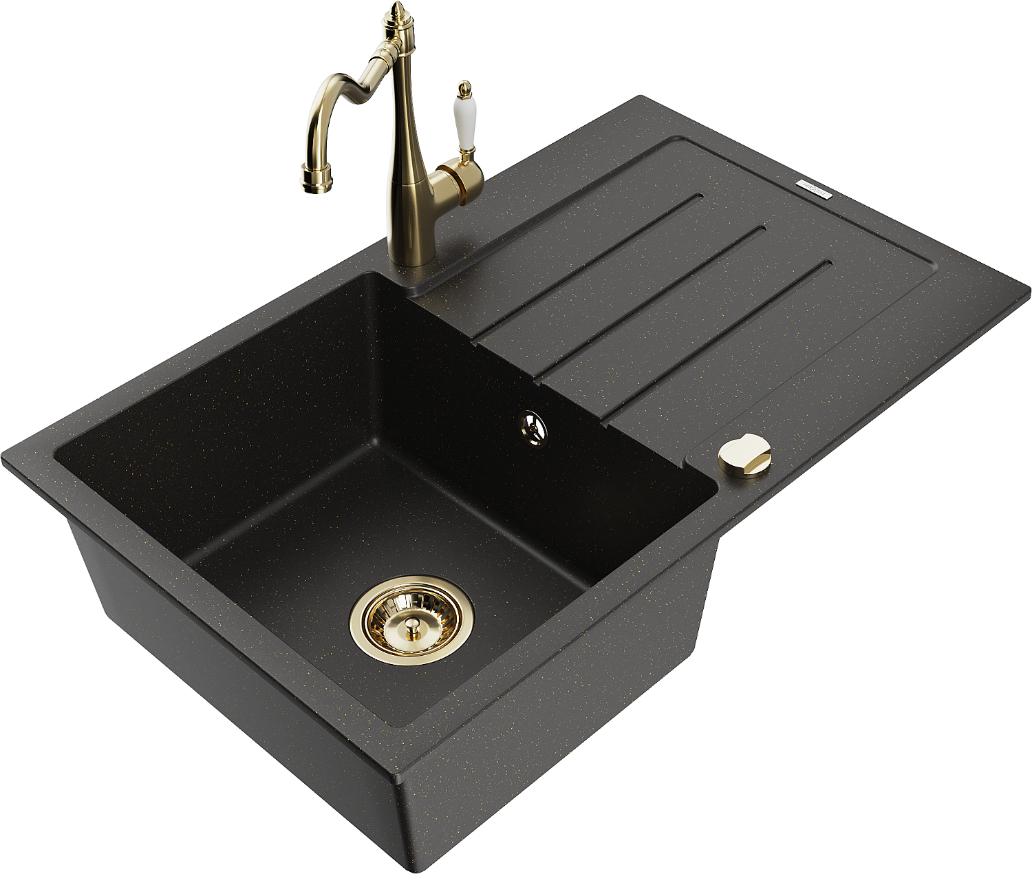 Mexen Bruno гранитна мивка с една камера с отцедник и кухненски смесител Carla, черен/златен металик - 6513-75-670700-50