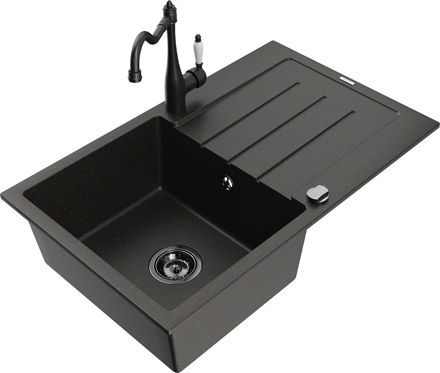 Mexen Bruno гранитна мивка с една камера с отцедник и кухненски смесител Carla, черен/златен металик - 6513-75-670700-70-B