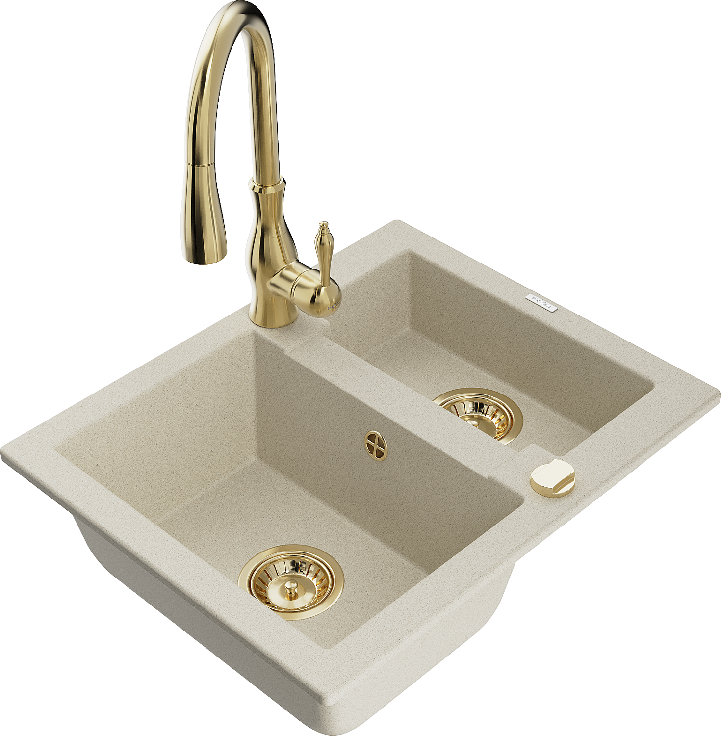Mexen Carlos гранитна кухненска мивка с 1,5 камери и кухненски смесител Savita, бежов - 6518-69-672601-50