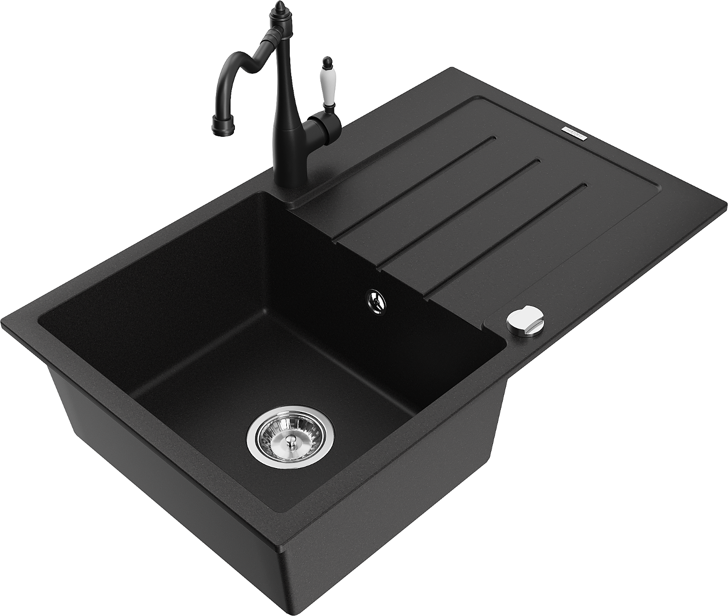 Mexen Bruno кухненска мивка от гранит с 1 корито с отцеждаща площ и кухненски смесител Carla, черен - 6513-77-670700-70