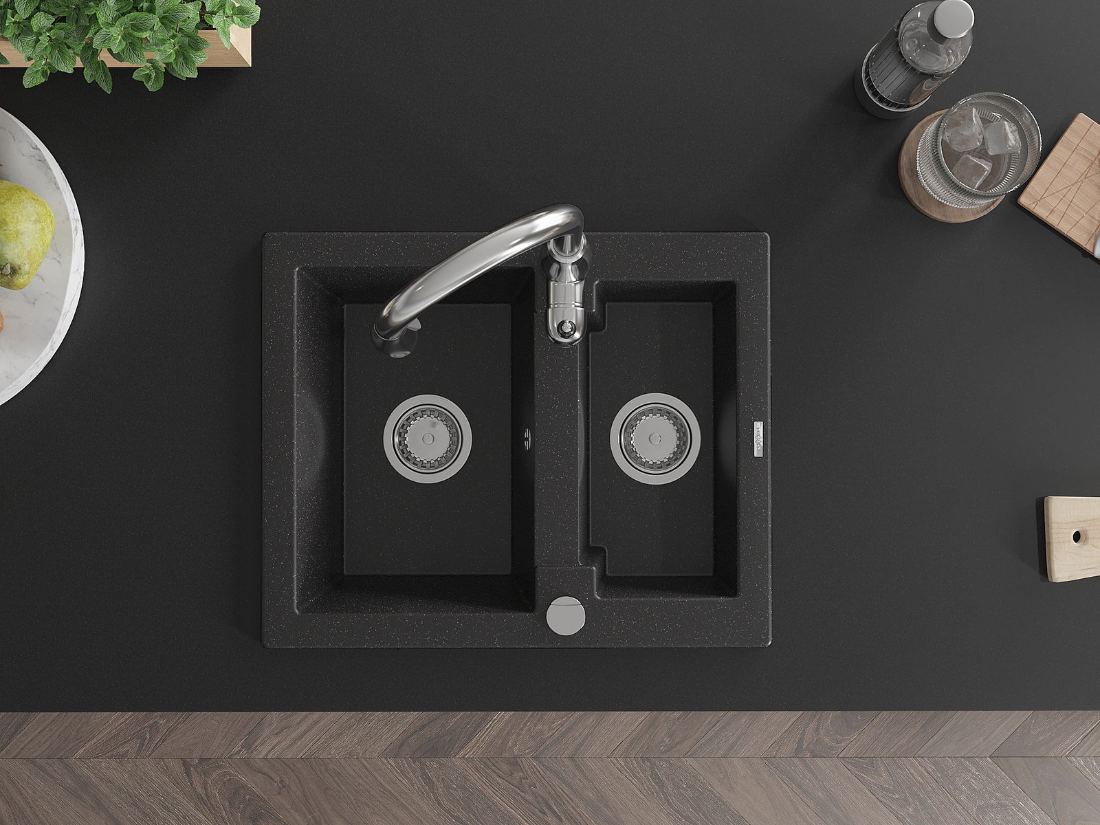 Mexen Carlos гранитна мивка с полуторен басейн с кухненски смесител Savita, черен/сребърен металик - 6518-73-672601-00