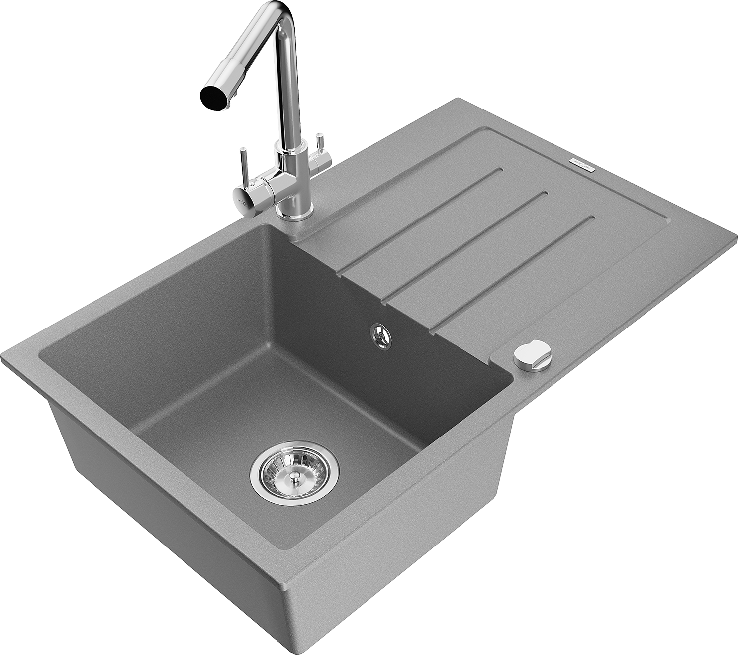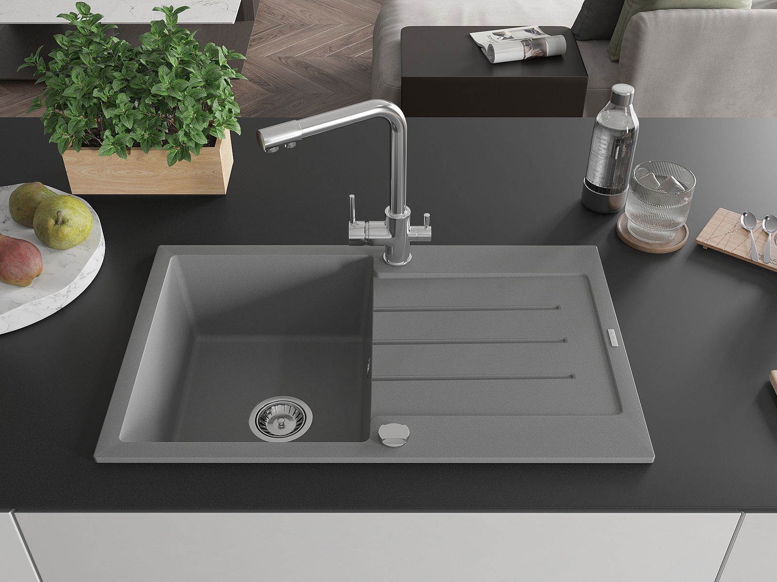 Mexen Bruno гранитна кухненска мивка с една камера с отцедник и кухненски смесител Duero, сив - 6513-71-671600-00