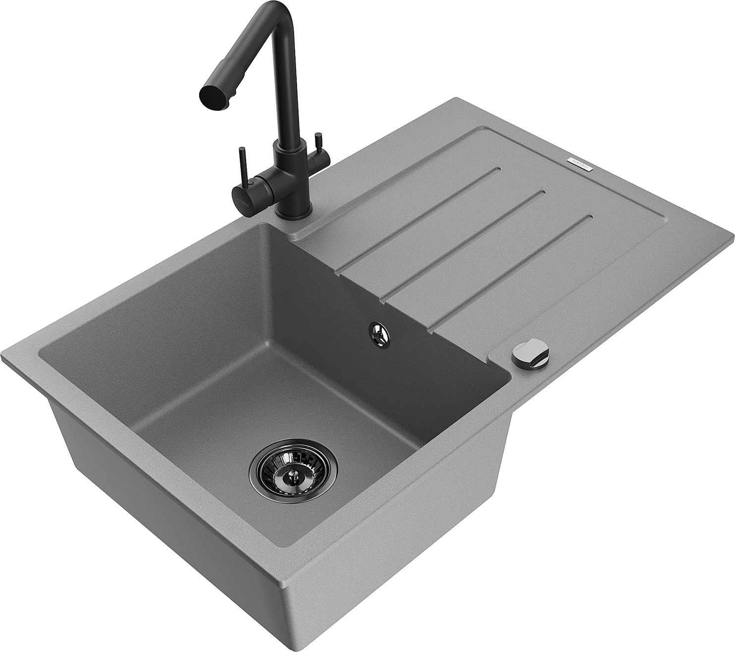 Гранитна мивка с една камера с отцедник и кухненски смесител Duero, сив - 6513-71-671600-70-B
