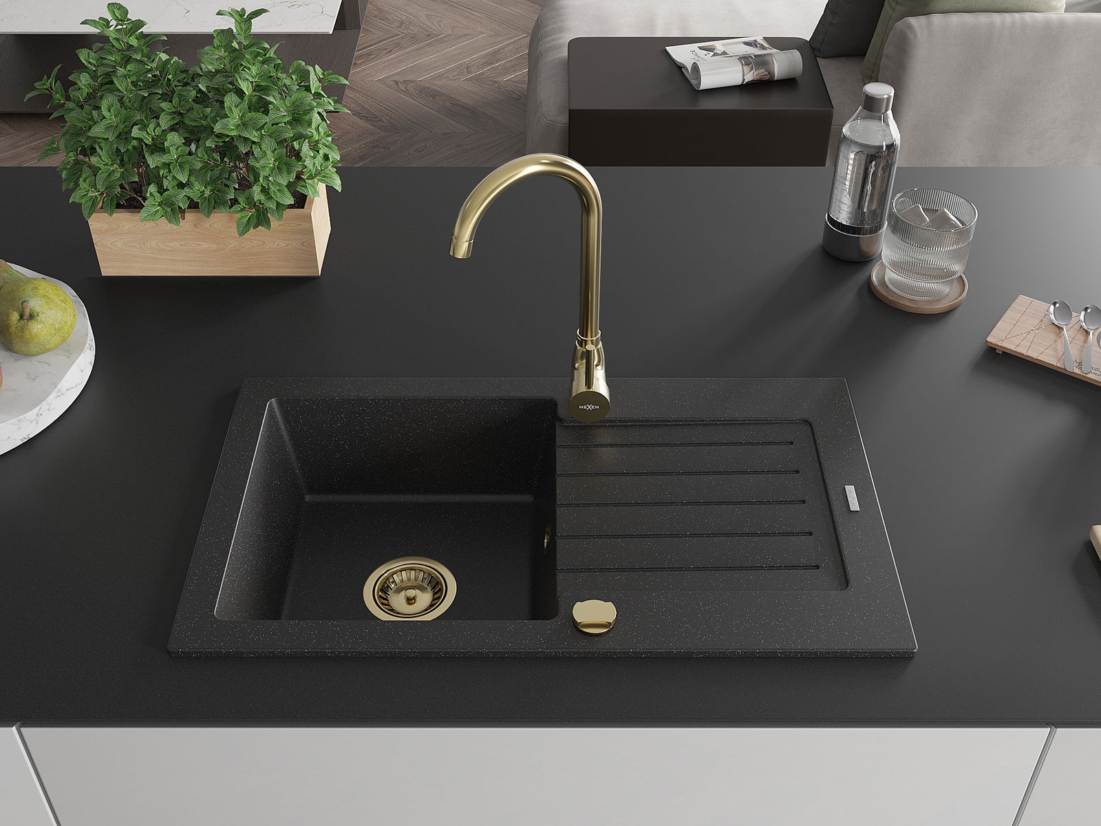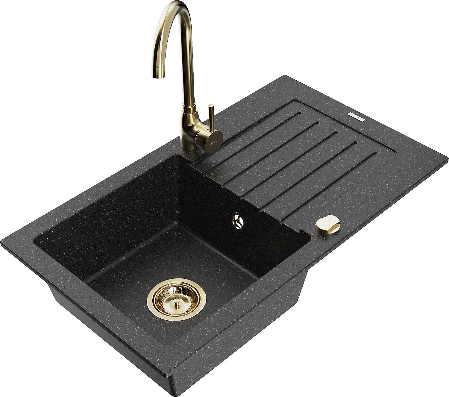 Mexen Pablo кухненска мивка от гранит с 1 отделение и отцедник и кухненски смесител Telma, черен/сребърен - 6510-73-670200-50