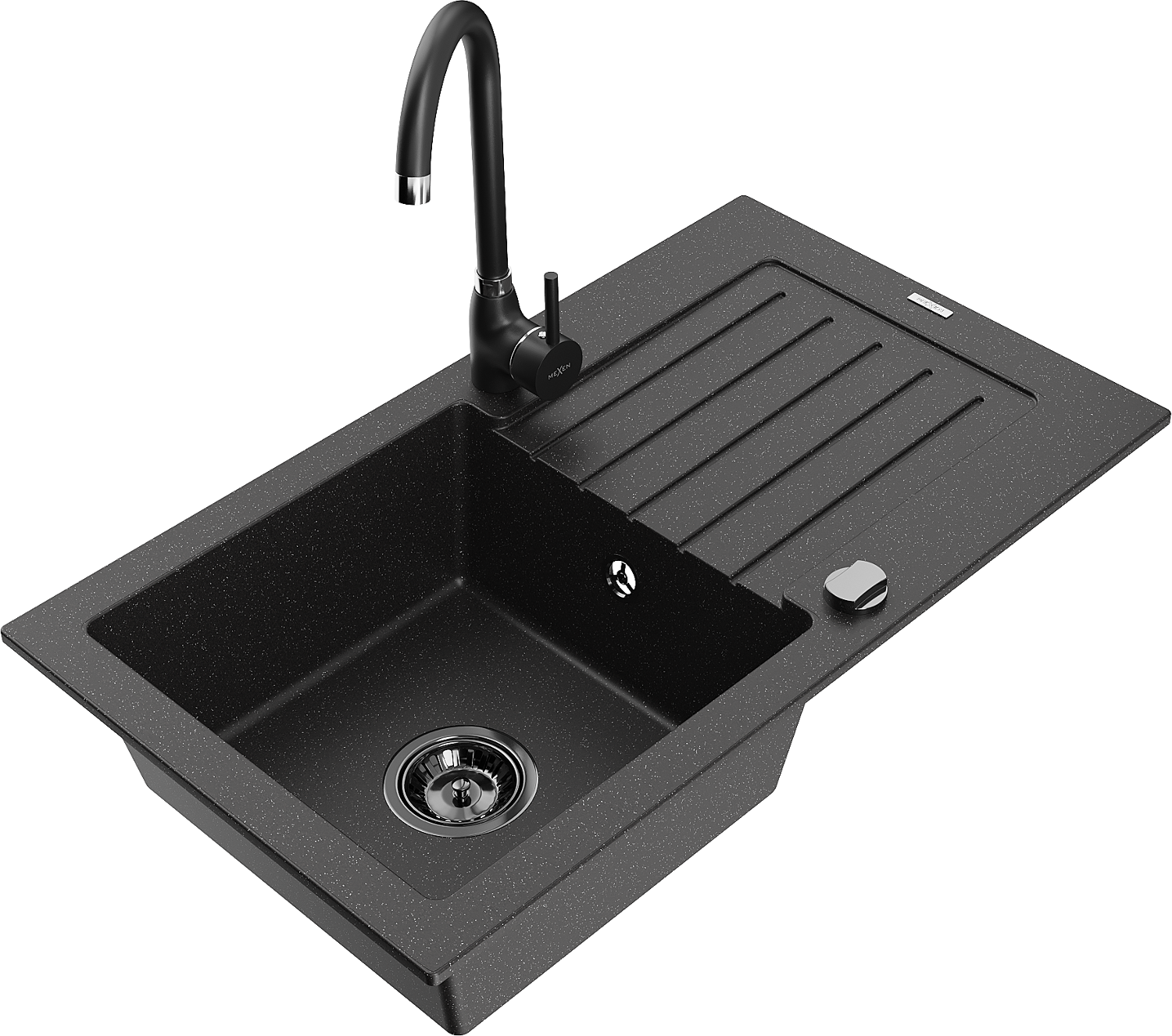 Mexen Pablo кухненска мивка от гранит с 1 отделение с отцедник и кухненски смесител Telma, черен/сребърен - 6510-73-670200-70-B