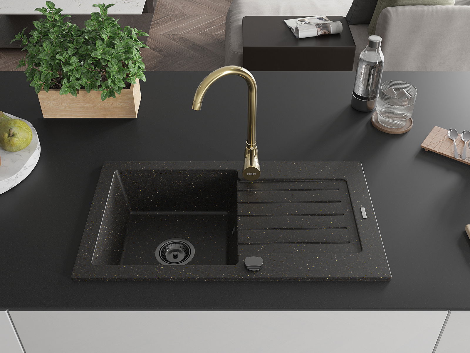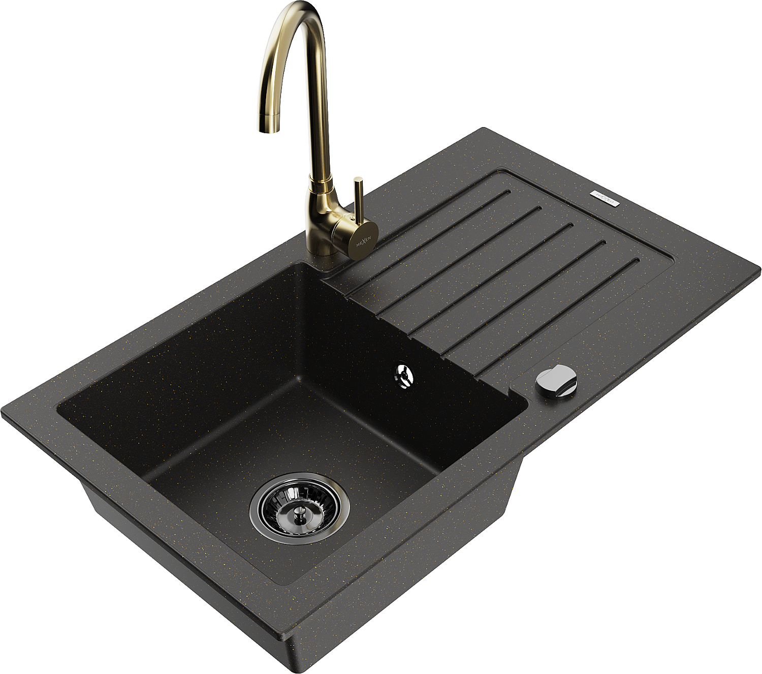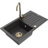 Mexen Pablo гранитна мивка с 1 корито с отцедник и кухненски смесител Telma, черен/златен - 6510-75-670200-50-B