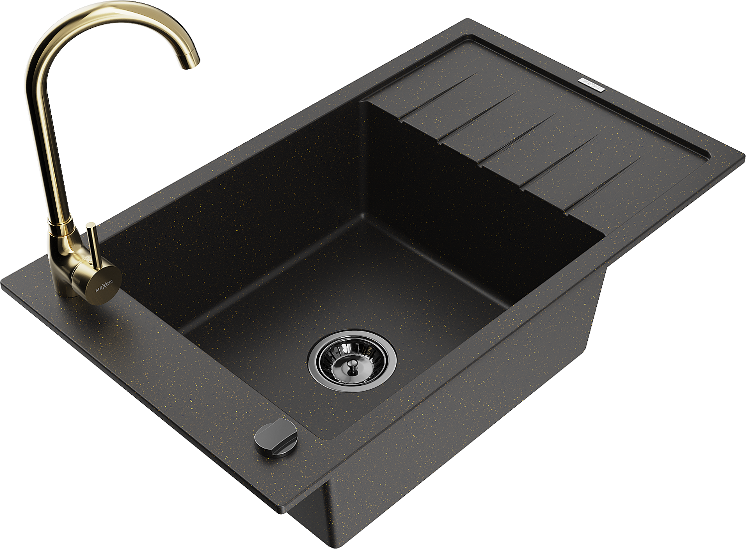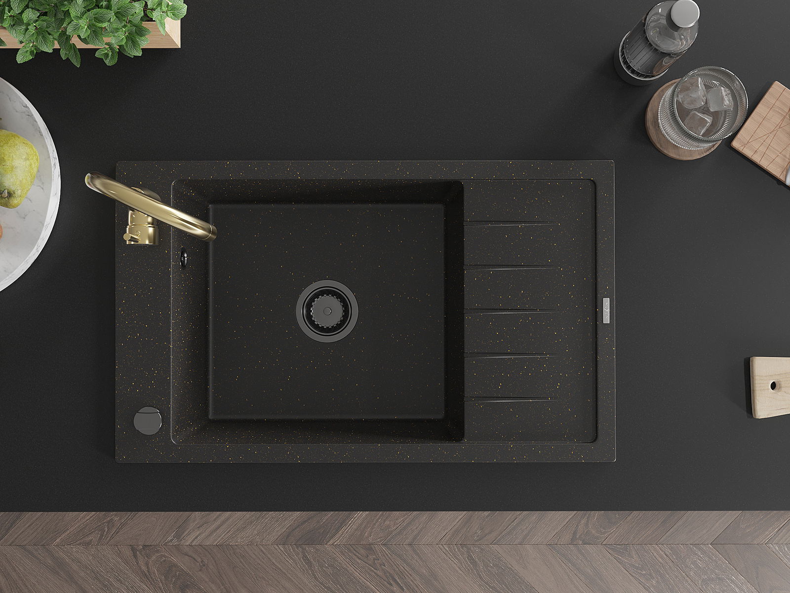 Гранитна кухненска мивка Mexen Elias с едно корито с отцедник и кухненски смесител Telma, черно/златно - 6511-75-670200-50-B