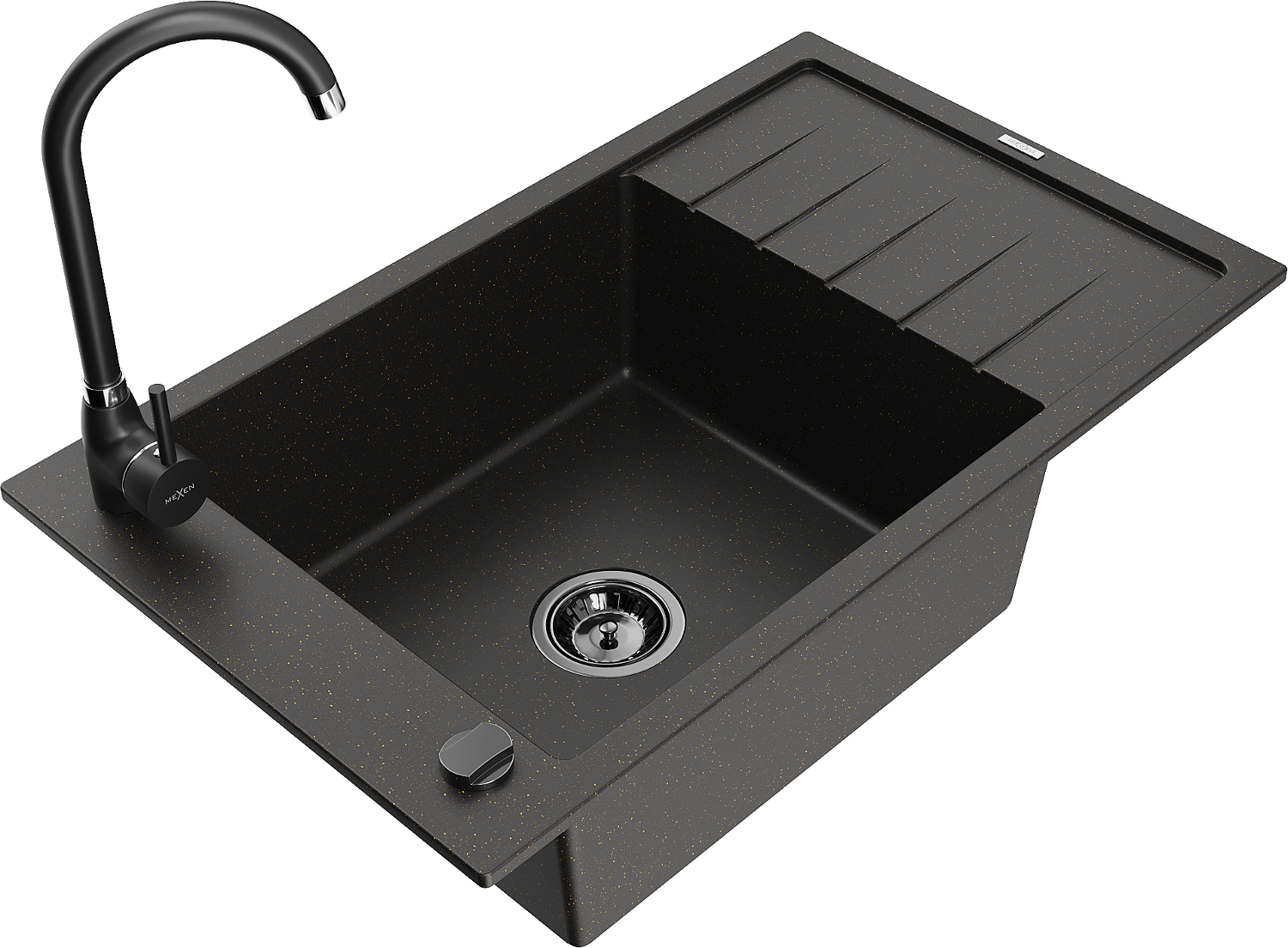 Mexen Elias гранитна мивка с 1 корито с отцедник и кухненски смесител Telma, черна/златна - 6511-75-670200-70-B