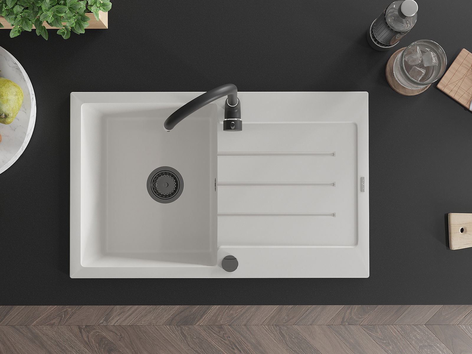 Mexen Bruno гранитна кухненска мивка с 1 камера с отцедник и кухненски смесител Telma, бял - 6513-20-670200-70