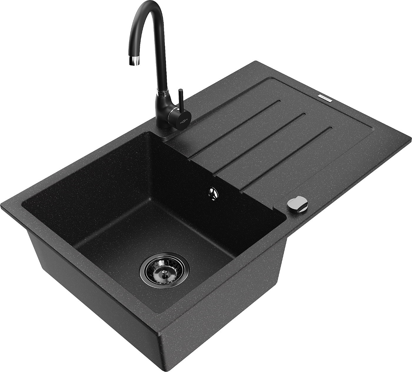 Mexen Bruno гранитна мивка с една камера с отцедник и кухненски смесител Telma, черен/сребърен - 6513-73-670200-70-B