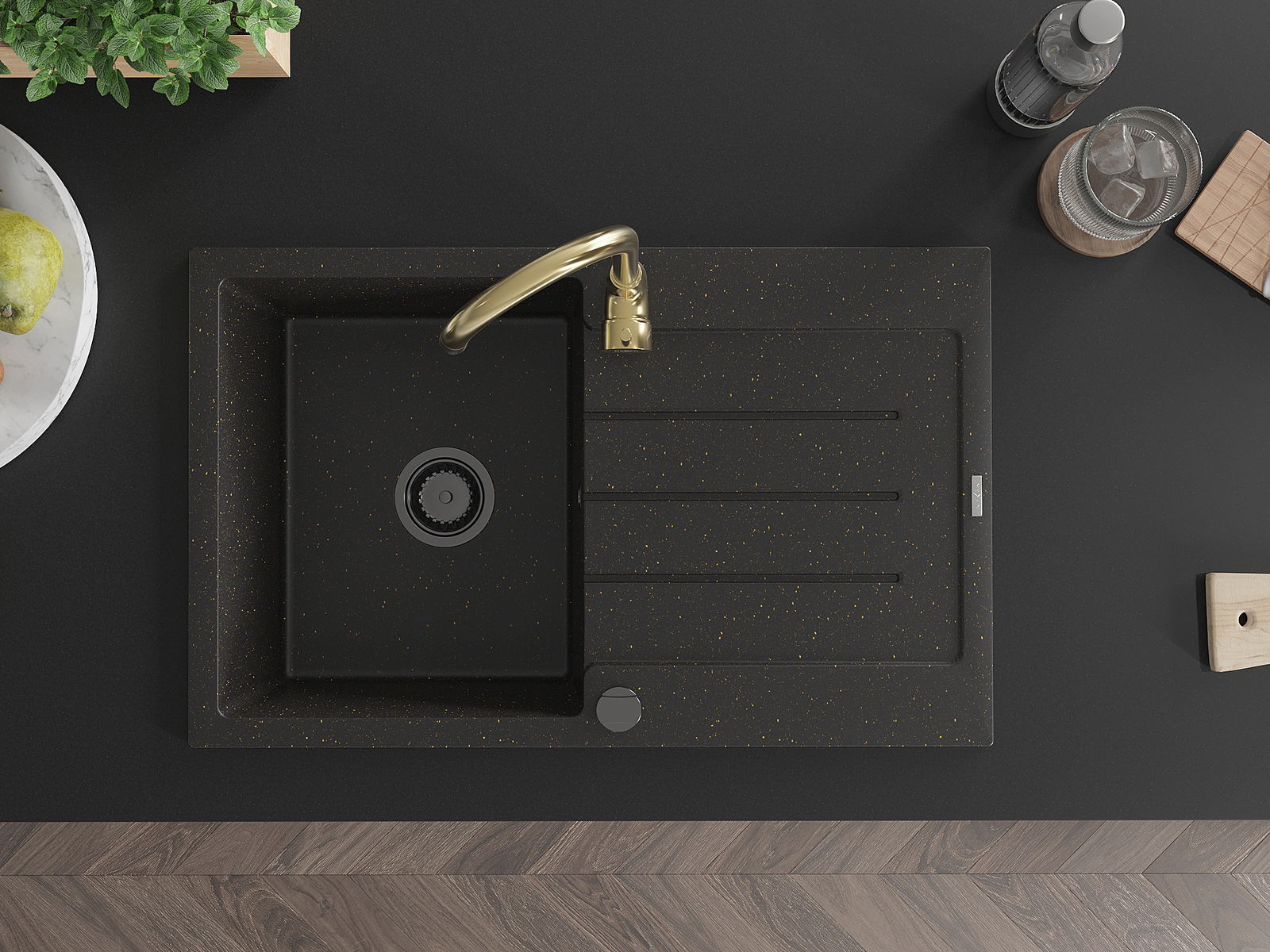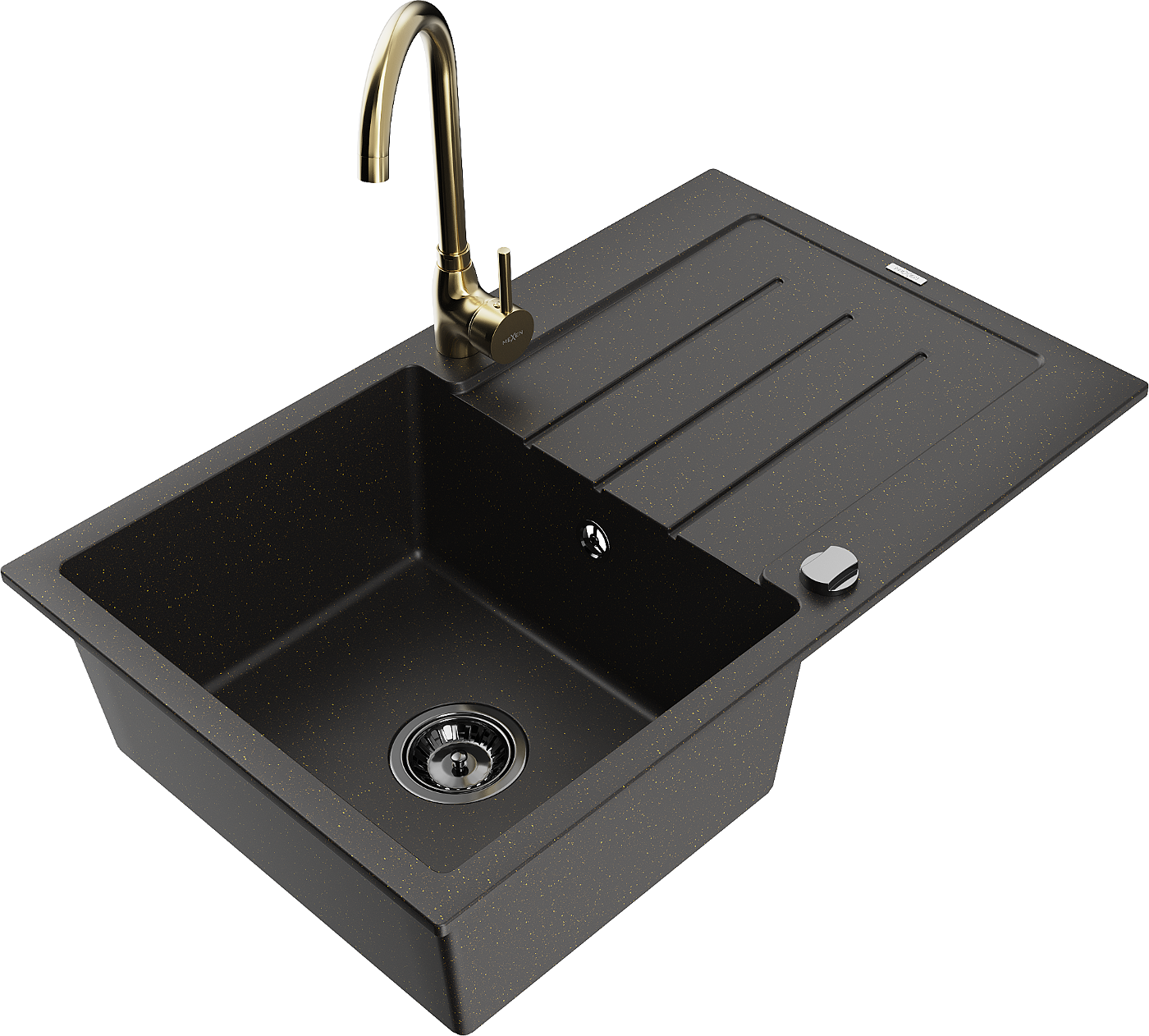 Гранитна мивка Mexen Bruno с една камера и отцедник и кухненски смесител Telma, черно/златно - 6513-75-670200-50-B
