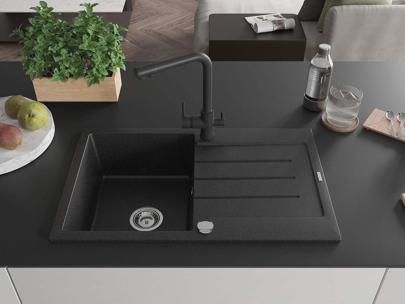 Мивката е направена от висококачествен гранит. Това е елегантно и най -вече практично допълнение към всяка кухня, независимо от нейния стил. Висококачествената и гранитна издръжливост осигуряват много години употреба.