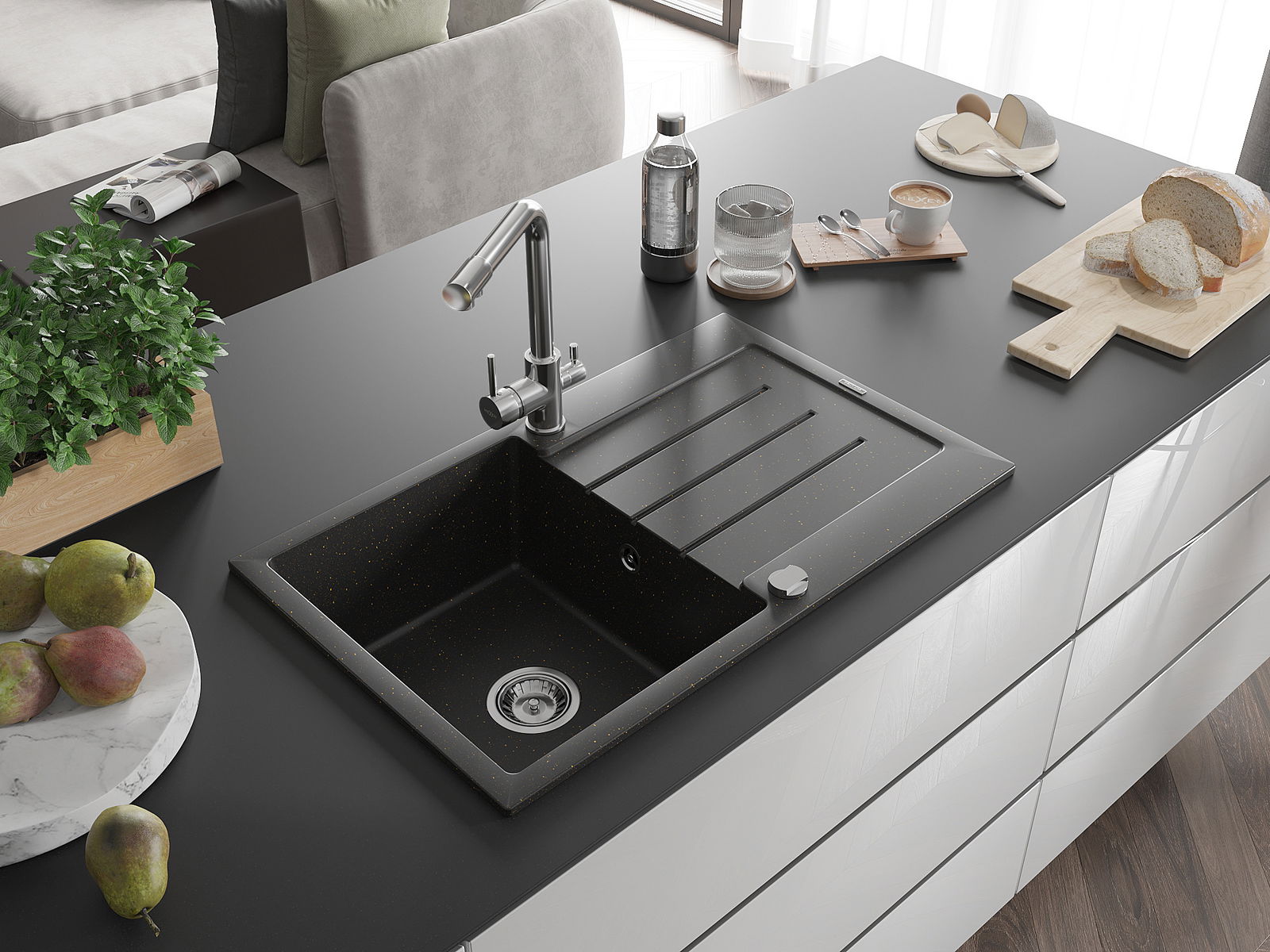 Мивката е направена от висококачествен гранит. Това е елегантно и най -вече практично допълнение към всяка кухня, независимо от нейния стил. Висококачествената и гранитна издръжливост осигуряват много години употреба.