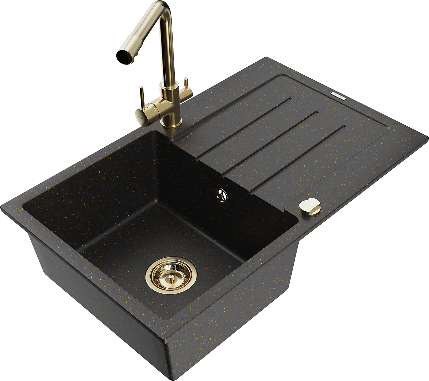 Mexen Bruno гранитна мивка с 1 отделение с дренаж и кухненски смесител Duero, черно/златист металик - 6513-75-671600-50