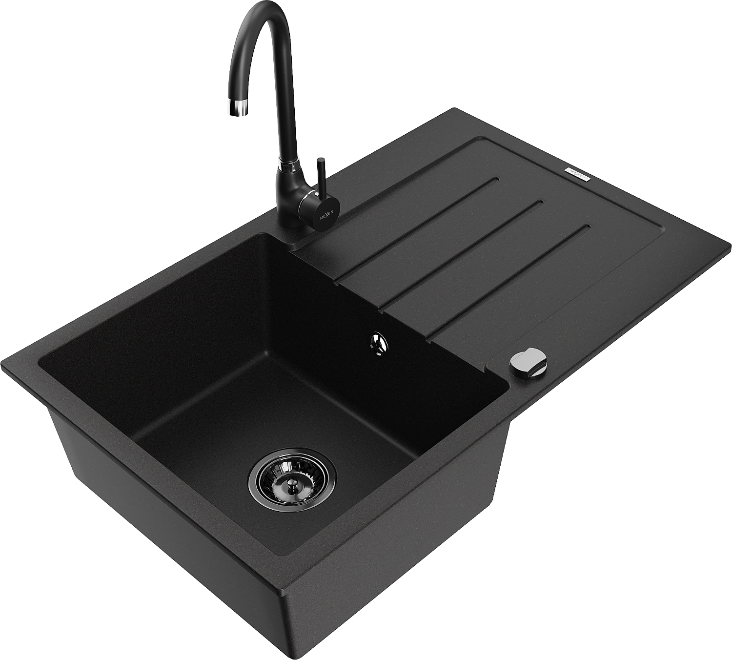 Mexen Bruno гранитна мивка с 1 отделение с капковоловител и кухненски смесител Telma, черен - 6513-77-670200-70-B