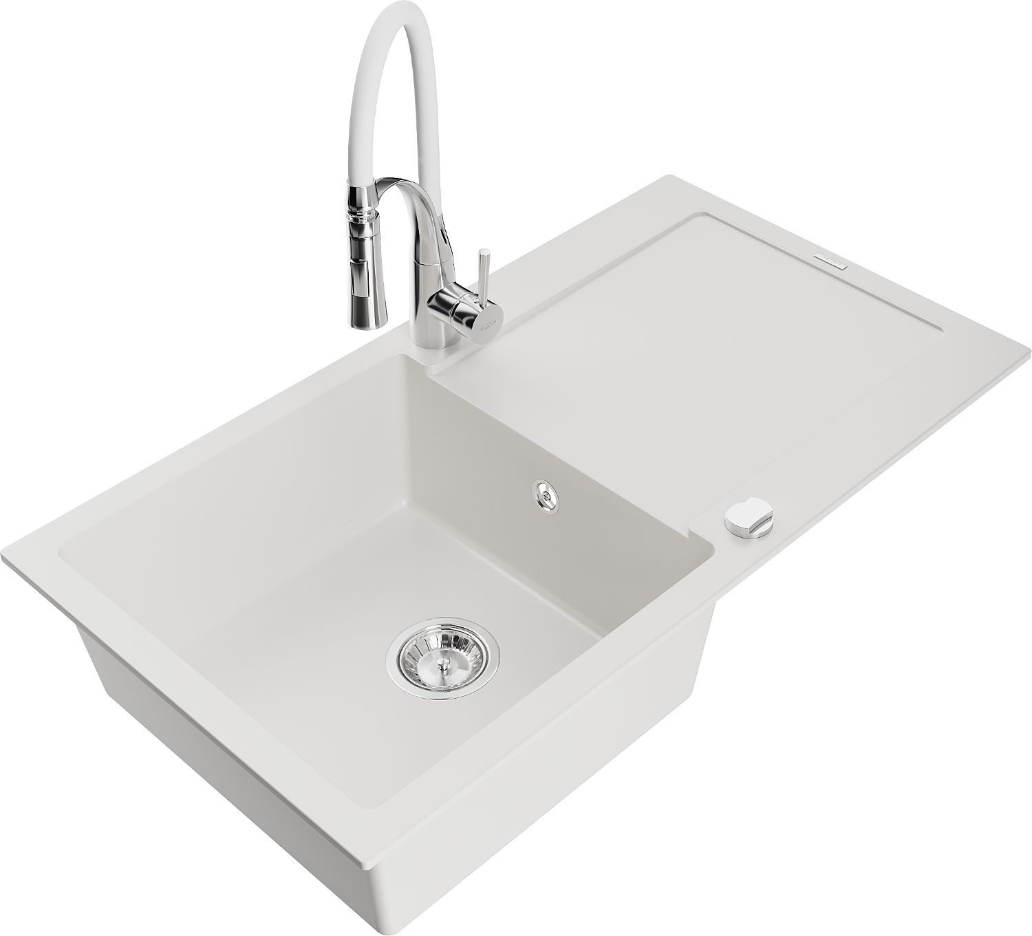 Mexen Leo гранитна мивка с 1 отделение с отцедник и кухненски смесител Aster, бял - 6501-20-73450-02