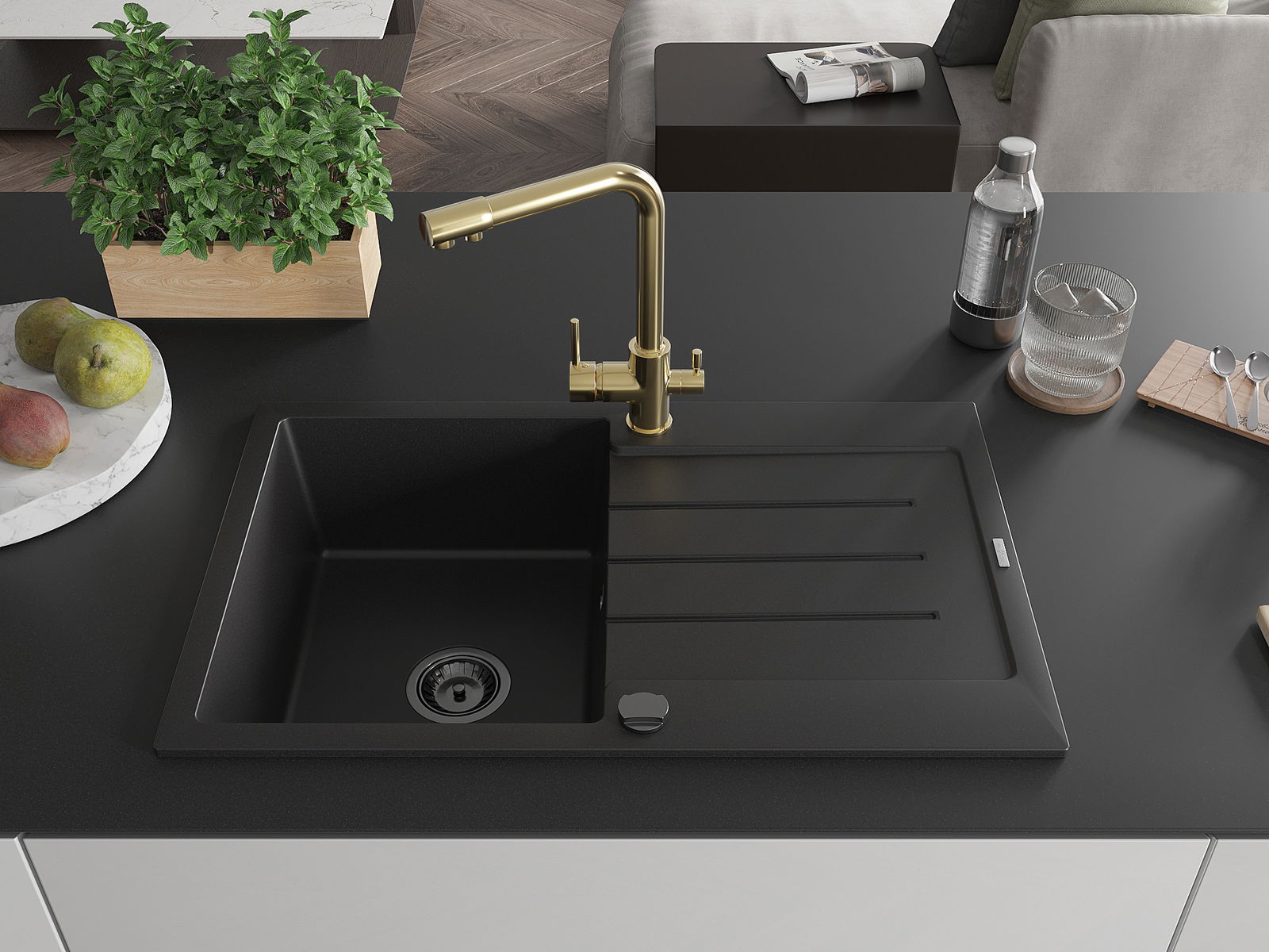 Мивката е направена от висококачествен гранит. Това е елегантно и най -вече практично допълнение към всяка кухня, независимо от нейния стил. Висококачествената и гранитна издръжливост осигуряват много години употреба.