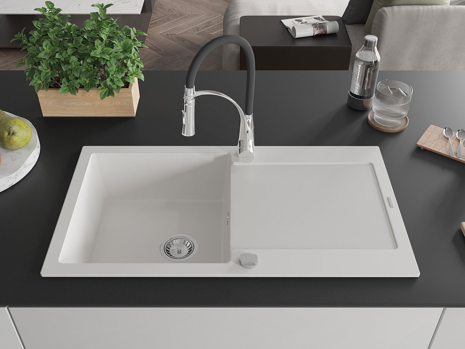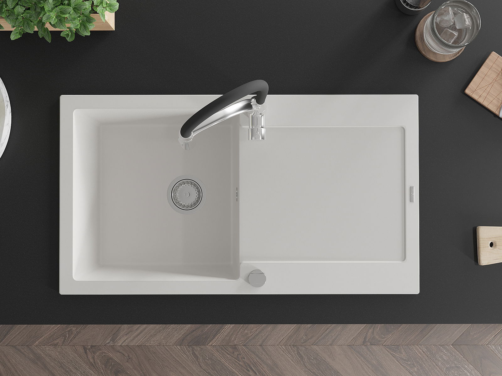 Mexen Leo гранитна мивка с едно корито с отцедник и кухненски смесител Aster, бял - 6501-20-73450-07