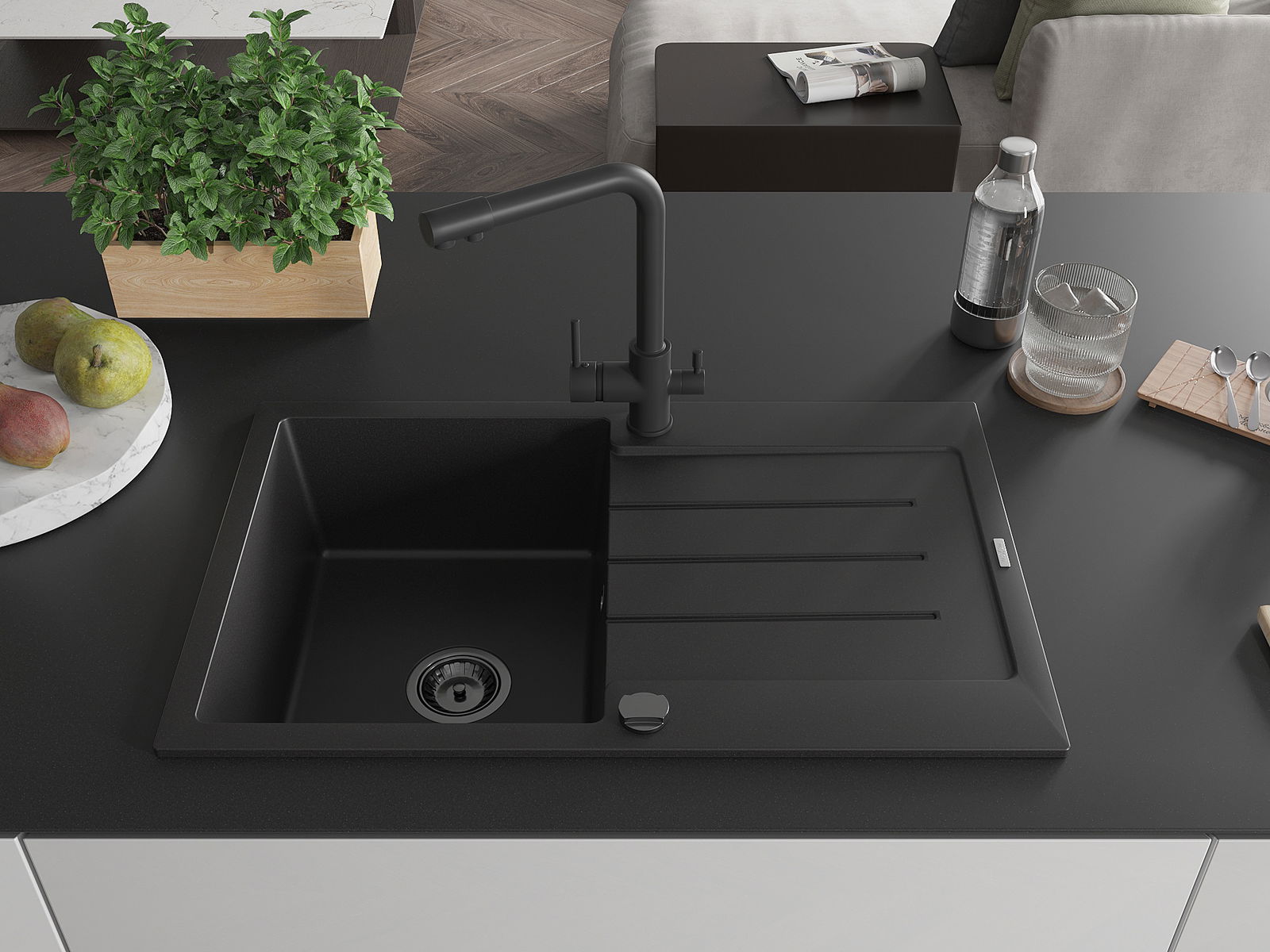 Мивката е направена от висококачествен гранит. Това е елегантно и най -вече практично допълнение към всяка кухня, независимо от нейния стил. Висококачествената и гранитна издръжливост осигуряват много години употреба.