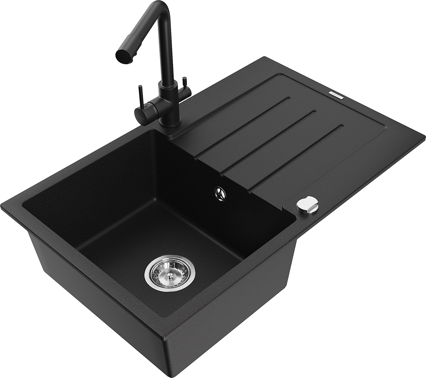 Mexen Bruno кухненска мивка от гранит с 1 камера, отцедник и кухненски смесител Duero, черен - 6513-77-671600-70