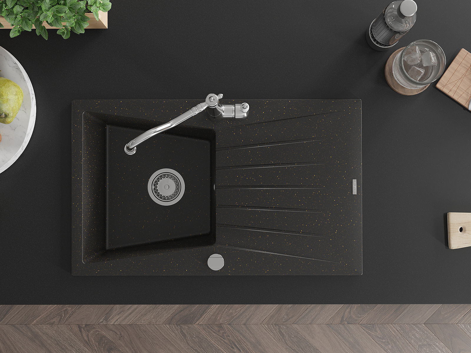 Mexen Cesar гранитна мивка с 1 корито с отцедник и кухненски смесител Carla, черен/златен металик - 6514-75-670700-00