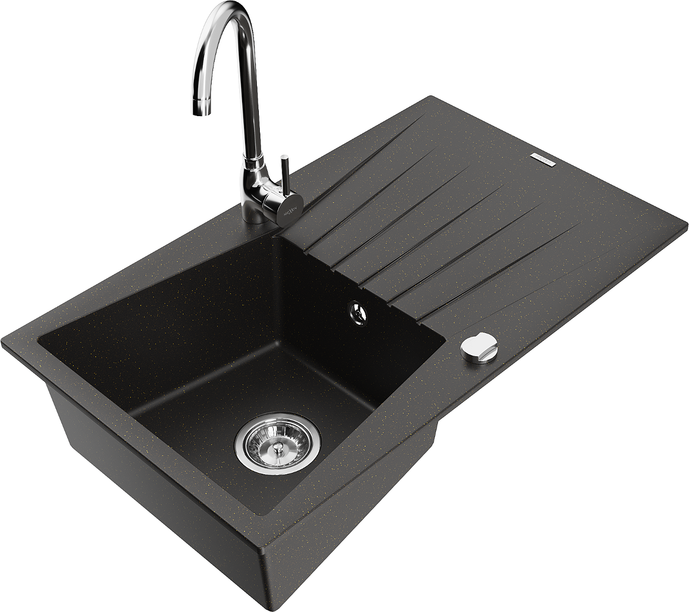 Гранитна кухненска мивка Mexen Cesar с една камера с отцедник и кухненски смесител Telma, черен/златен - 6514-75-670200-00