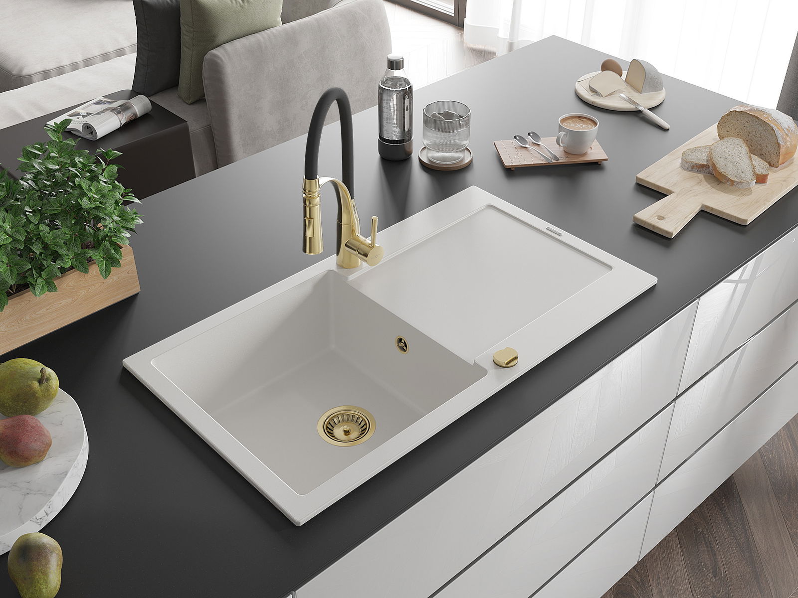 Мивката е направена от висококачествен гранит. Това е елегантно и най -вече практично допълнение към всяка кухня, независимо от нейния стил. Висококачествената и гранитна издръжливост осигуряват много години употреба.