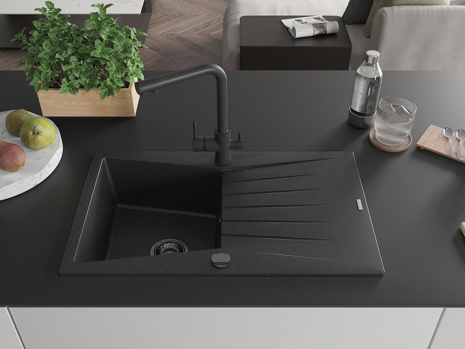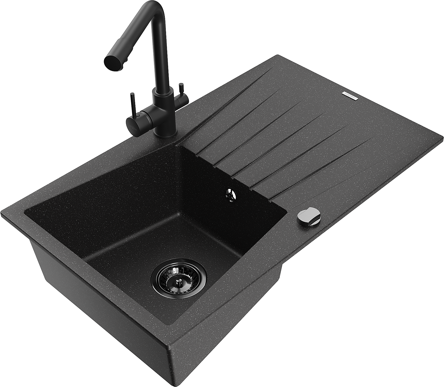 Mexen Cesar Гранитна мивка с 1 отделение и сушилна и кухненски смесител Duero, черен/сребрист металик - 6514-73-671600-70-B