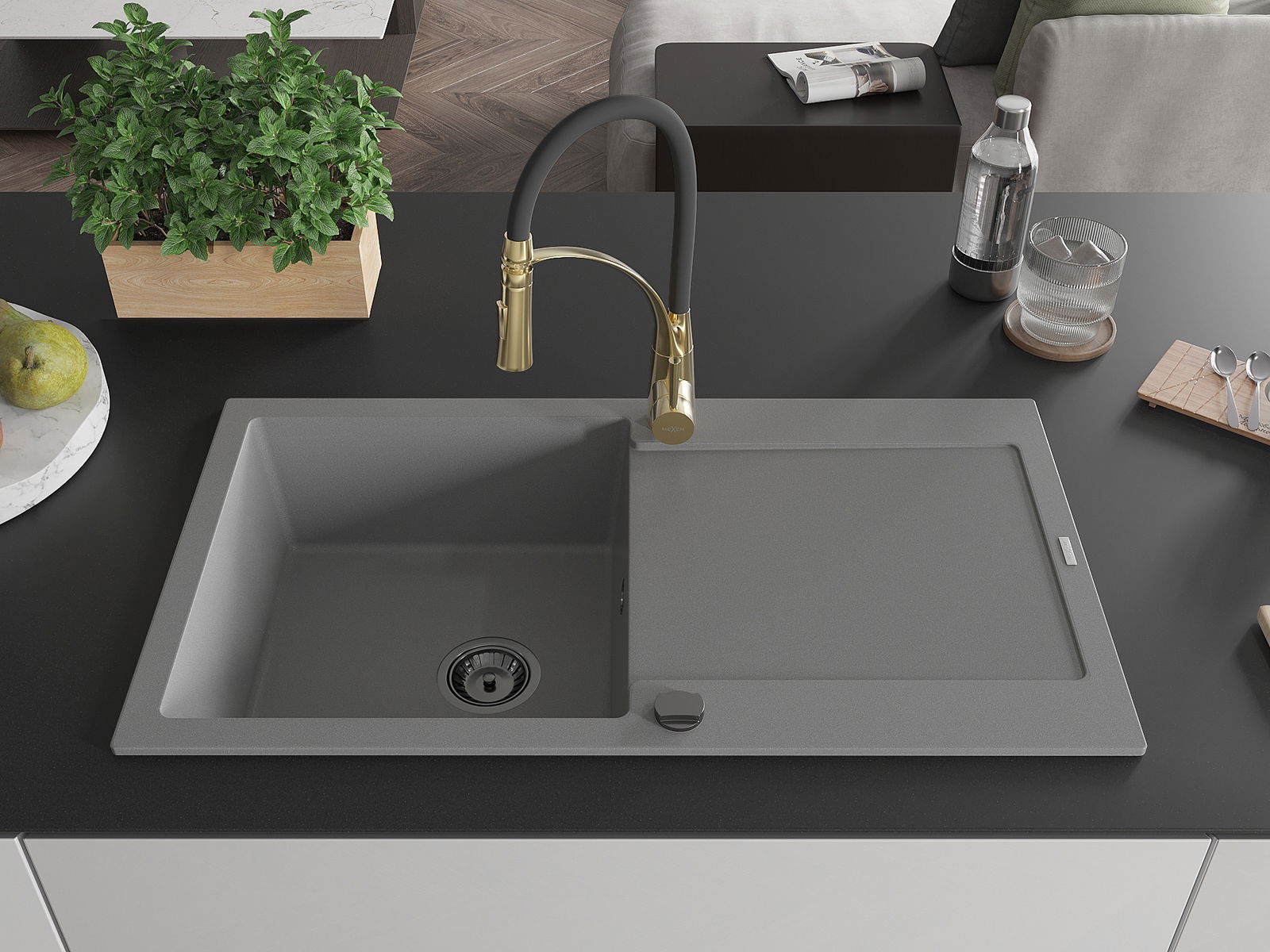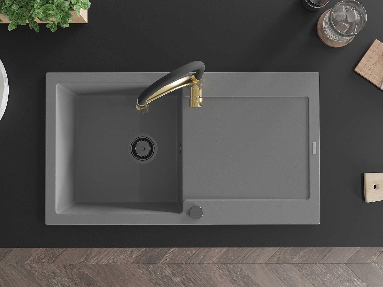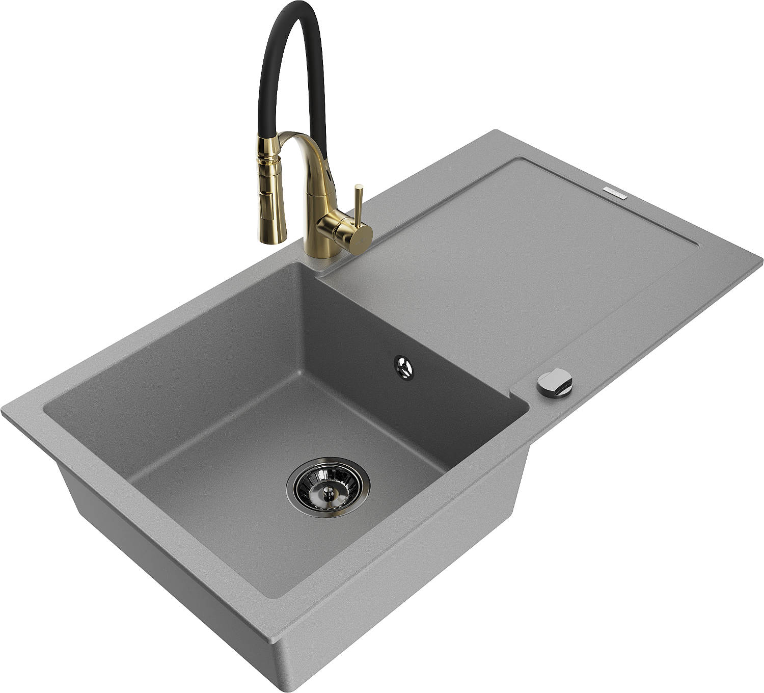 Mexen Leo гранитна мивка с 1 отделение с отцедник и кухненски смесител Aster, сив - 6501-71-73450-57-B