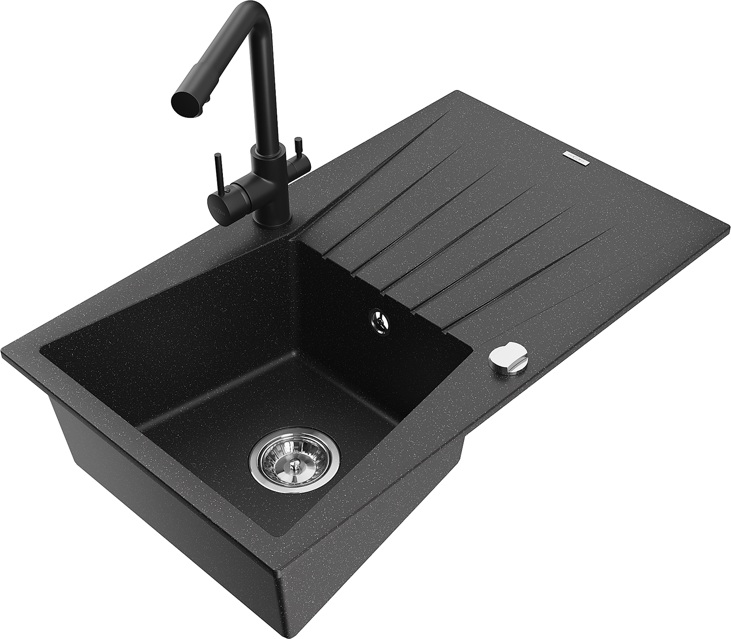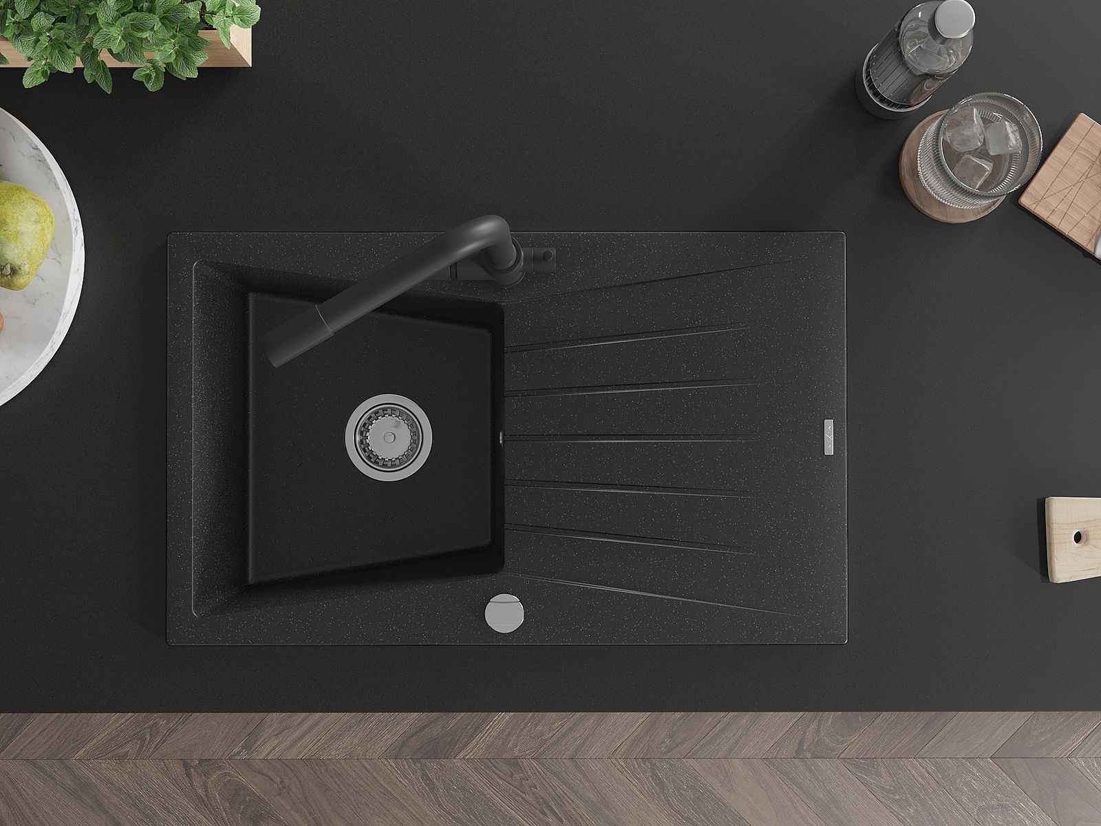 Mexen Cesar гранитна мивка с 1 отделение с отцедник и кухненски смесител Duero, черно/сребърен металик - 6514-73-671600-70