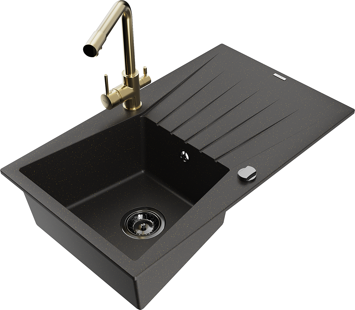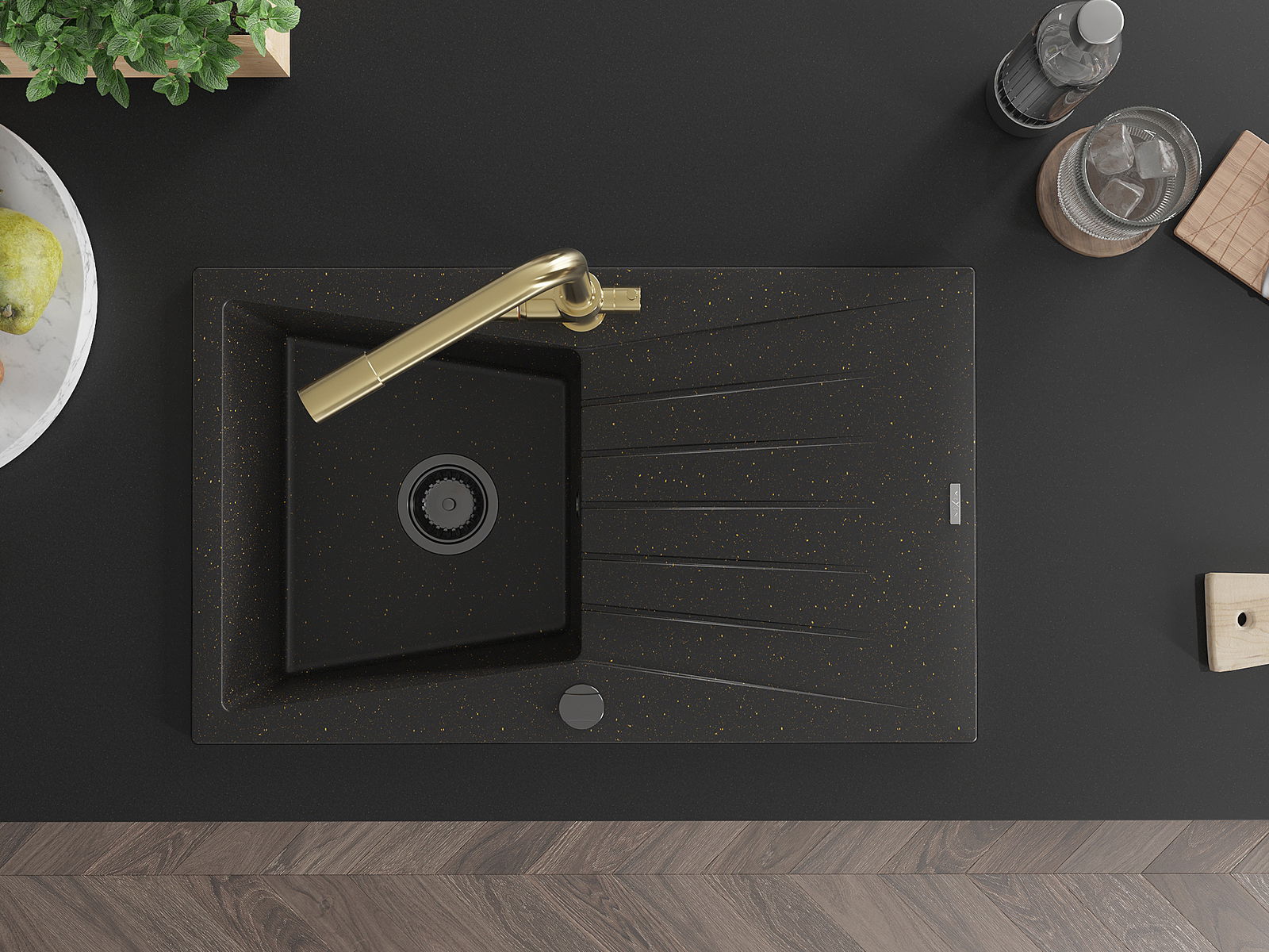 Mexen Cesar гранитна мивка с 1 отделение с отцедник и кухненски смесител Duero, черен/златен металик - 6514-75-671600-50-B