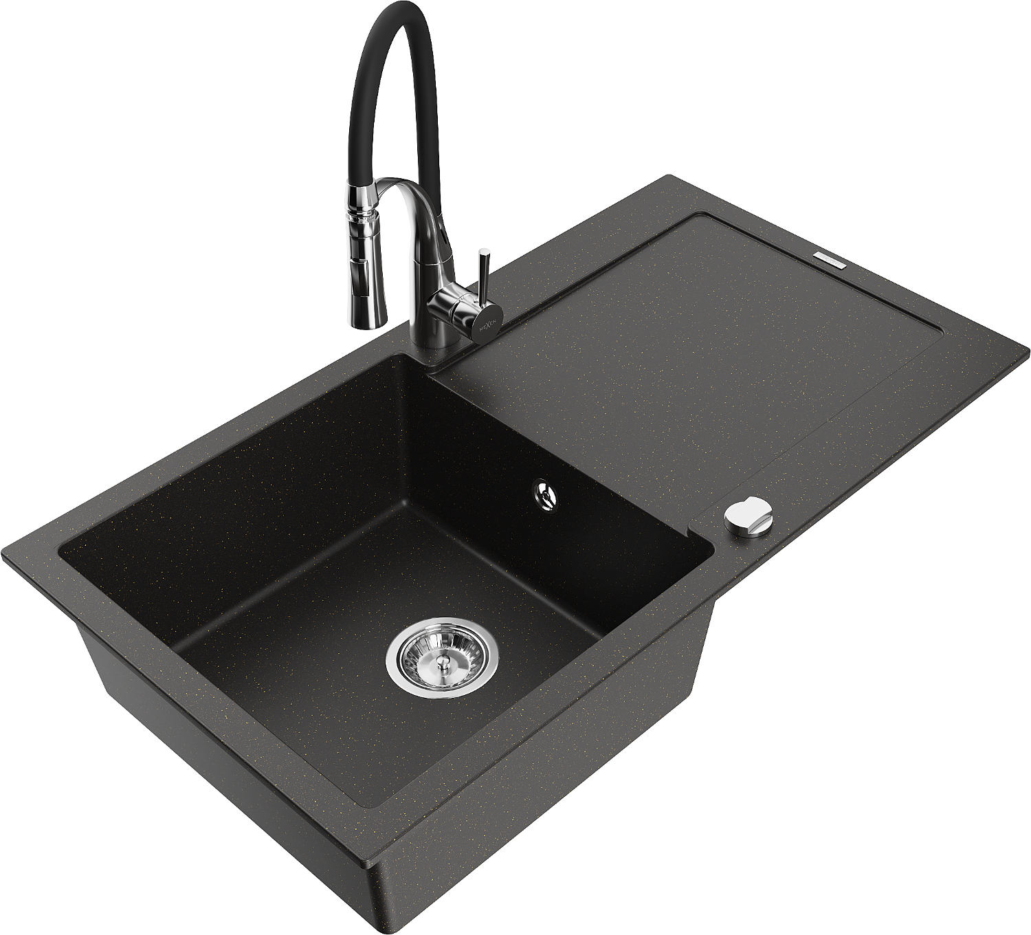 Mexen Leo гранитна мивка 1-компонентна с отцедник и кухненски смесител Aster, черен/златен металик - 6501-75-73450-07