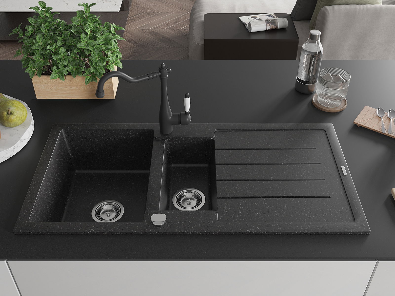 Мивката е направена от висококачествен гранит. Това е елегантно и най -вече практично допълнение към всяка кухня, независимо от нейния стил. Висококачествената и гранитна издръжливост осигуряват много години употреба.