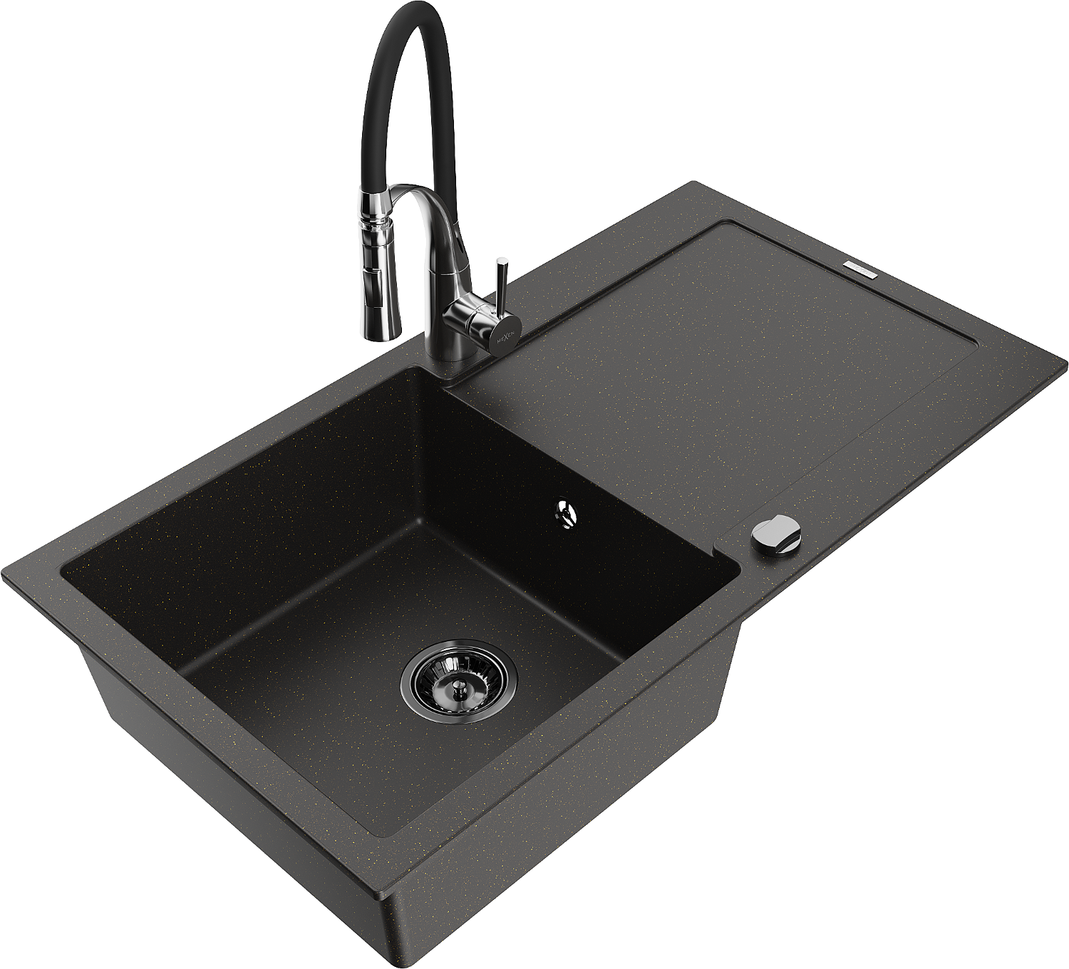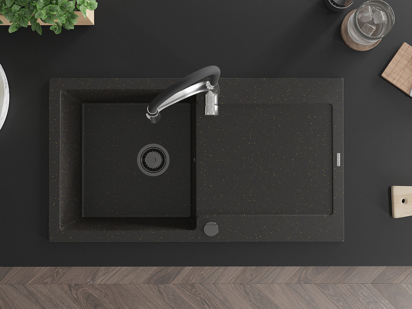 Mexen Leo гранитна мивка с 1 отделение с отцедник и кухненски смесител Aster, черно/златен металик - 6501-75-73450-07-B