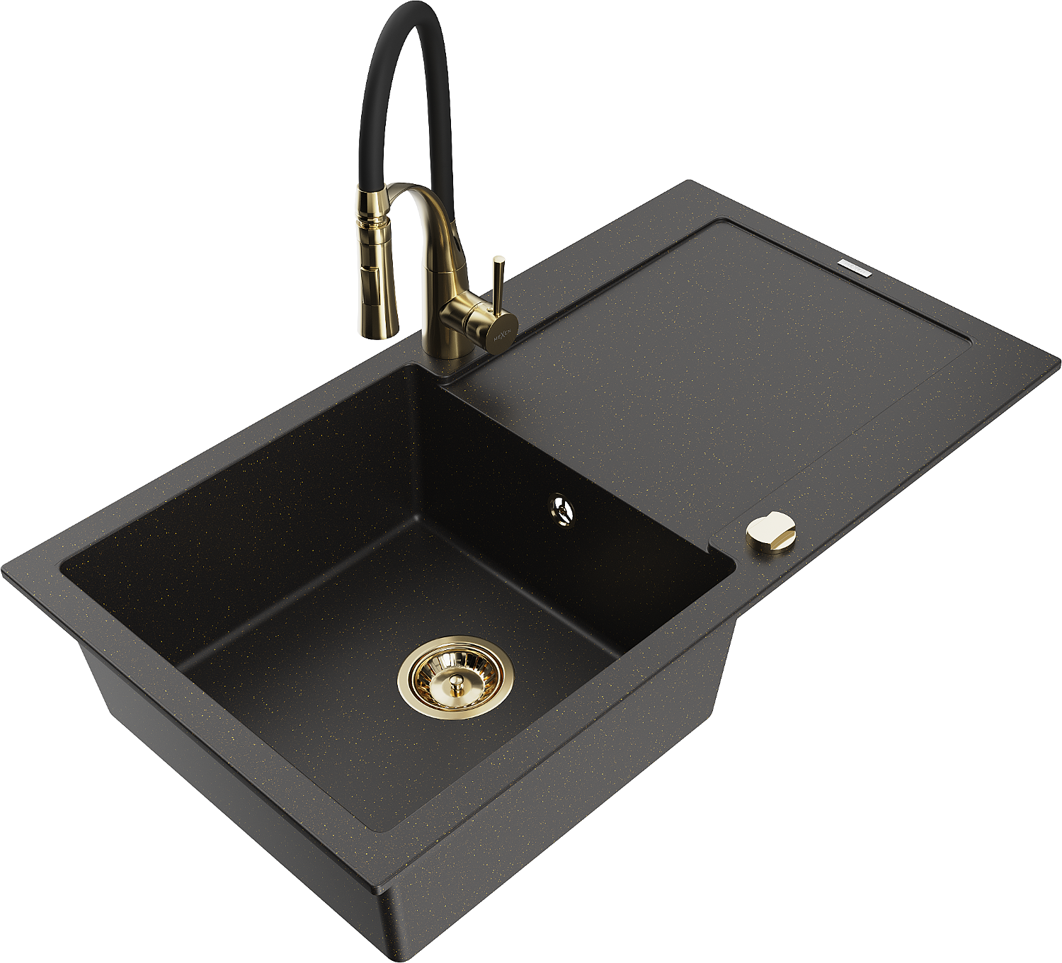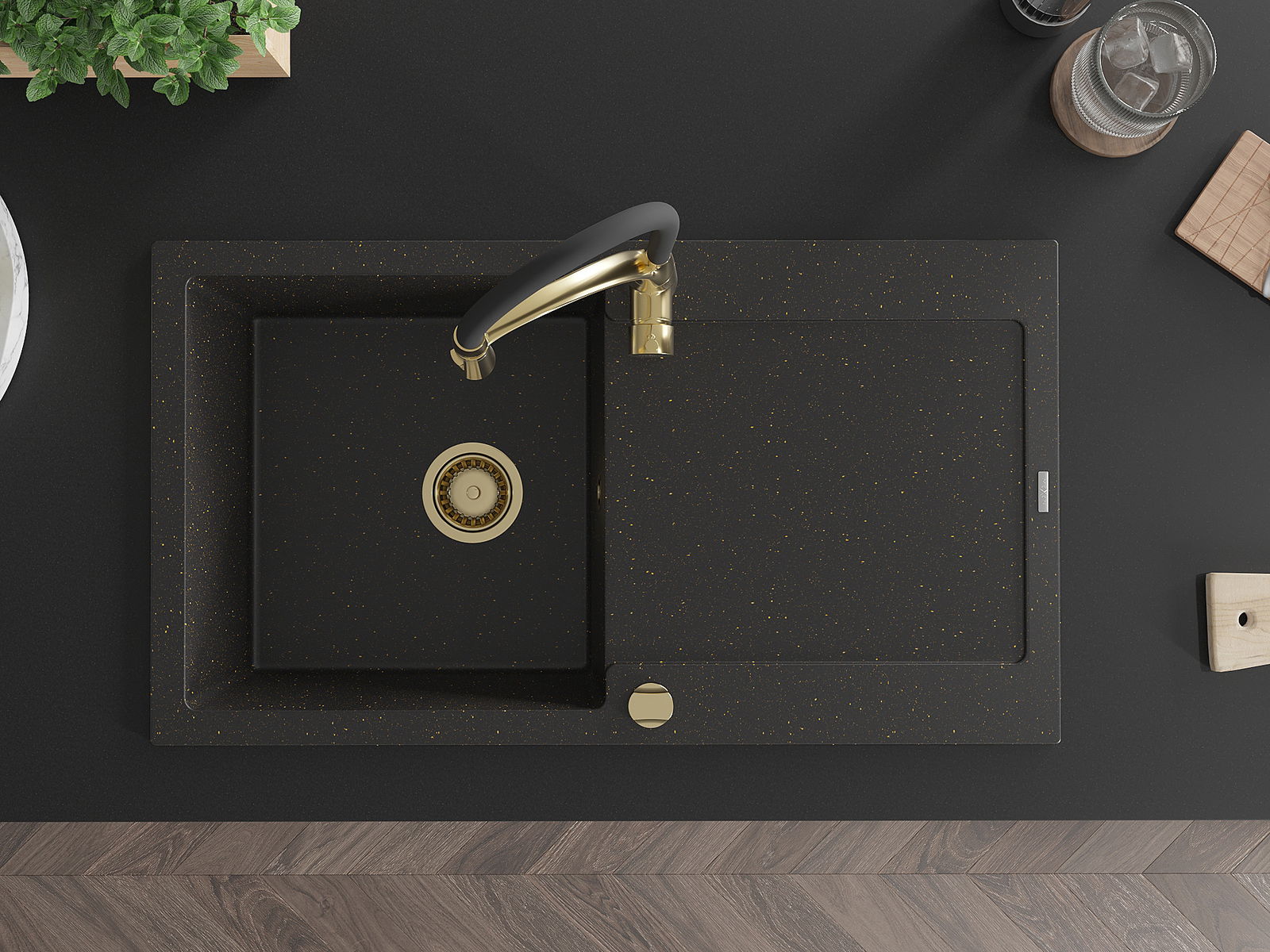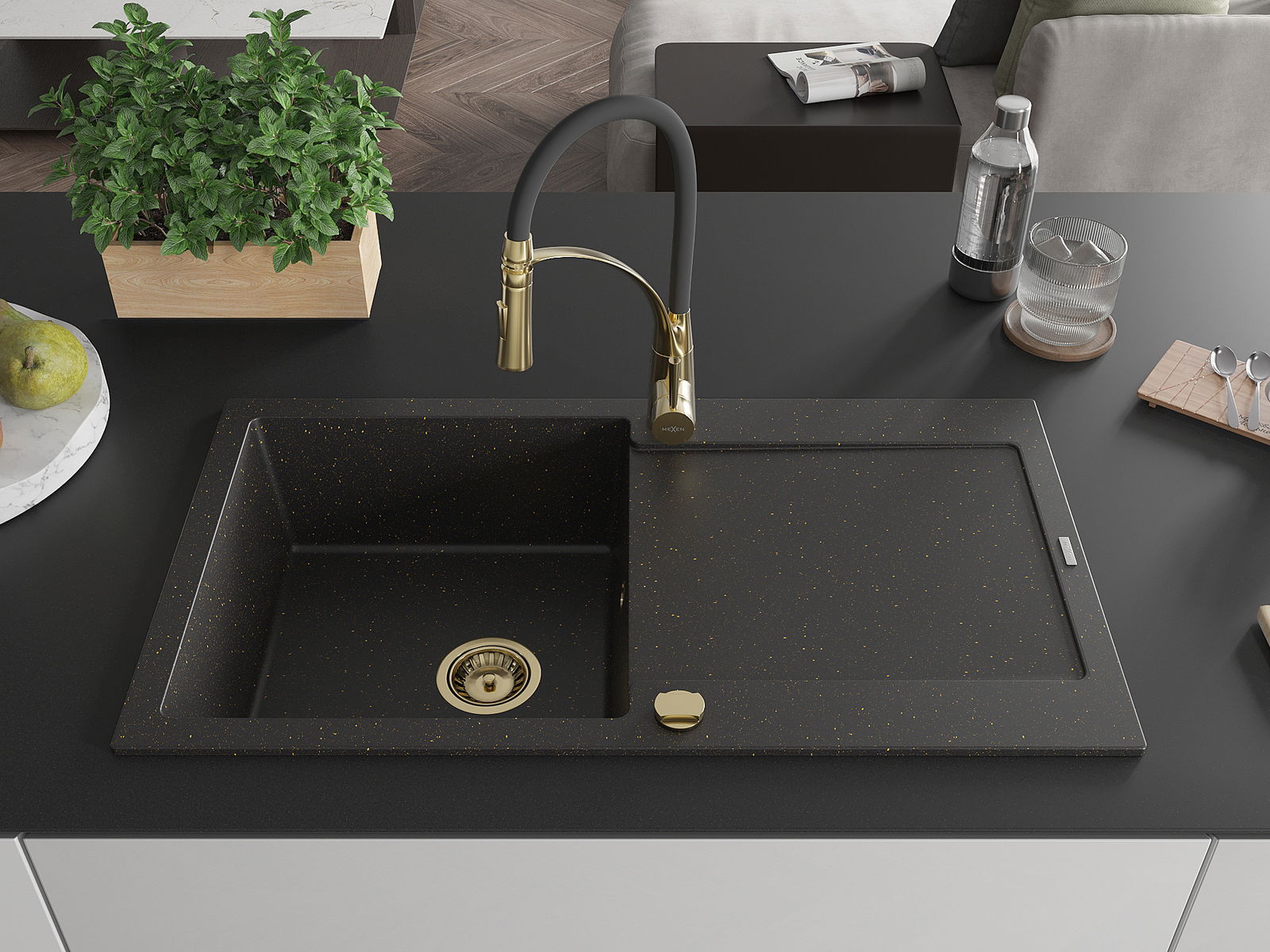 Mexen Leo мивка от гранит с 1 камера с дренаж и кухненски смесител Aster, черен/златен металик - 6501-75-73450-57-G