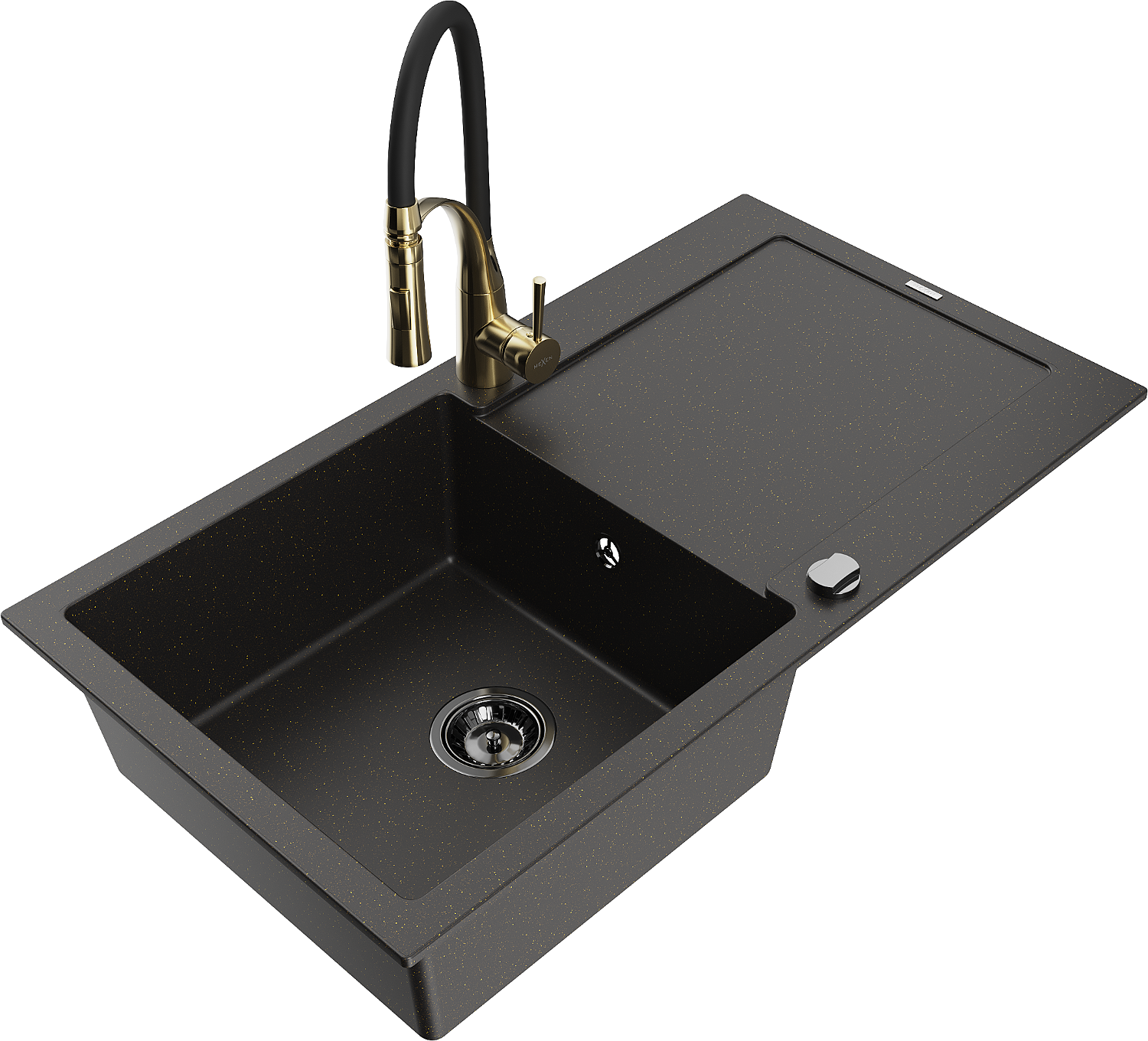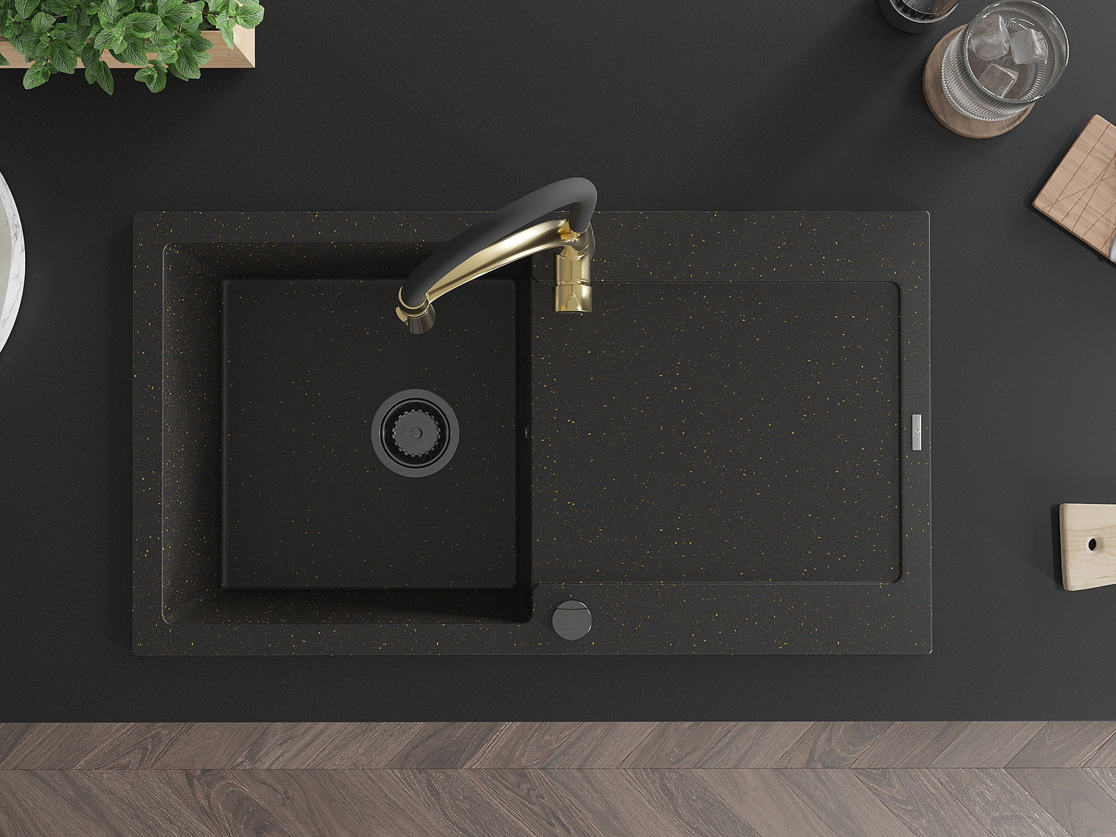 Mexen Leo гранитна кухненска мивка 1-коритна с отцедник и кухненски смесител Aster, черен/златен металик - 6501-75-73450-57-B
