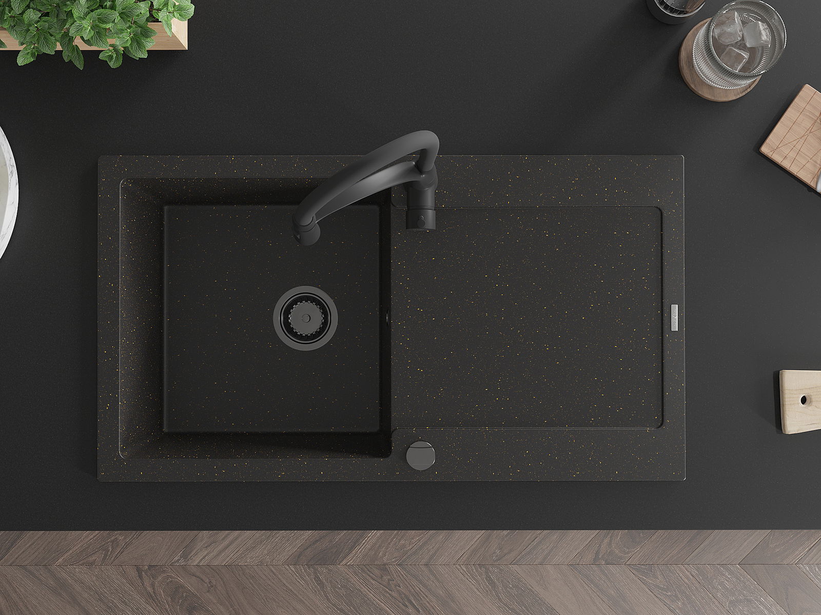 Mexen Leo гранитна мивка с 1 корито и отцедник и кухненски смесител Aster, черен/златен металик - 6501-75-73450-70-B