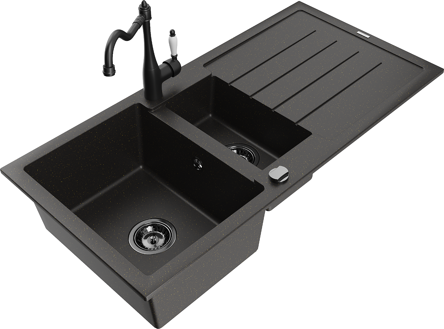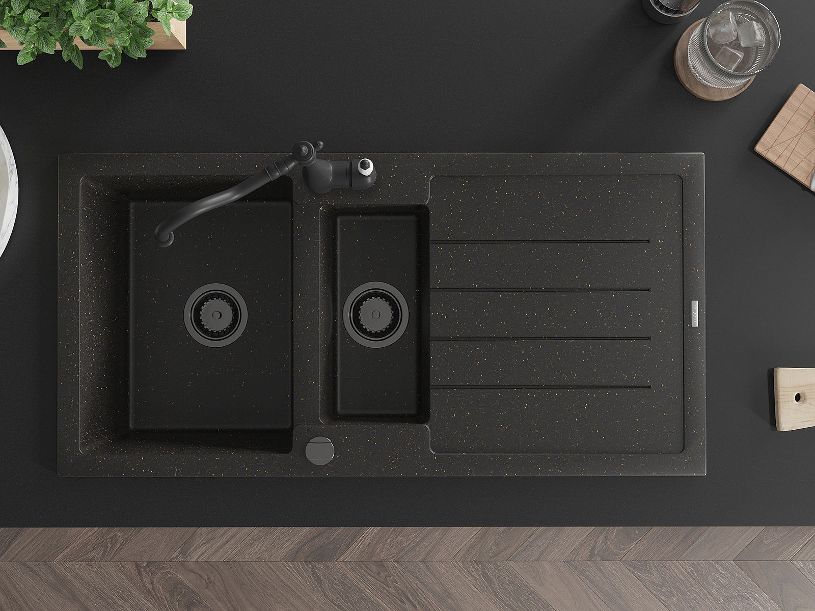 Mexen Andres гранитна мивка с 1,5 отделения с изсушител и кухненски смесител Carla, черен/златист - 6515-75-670700-70-B