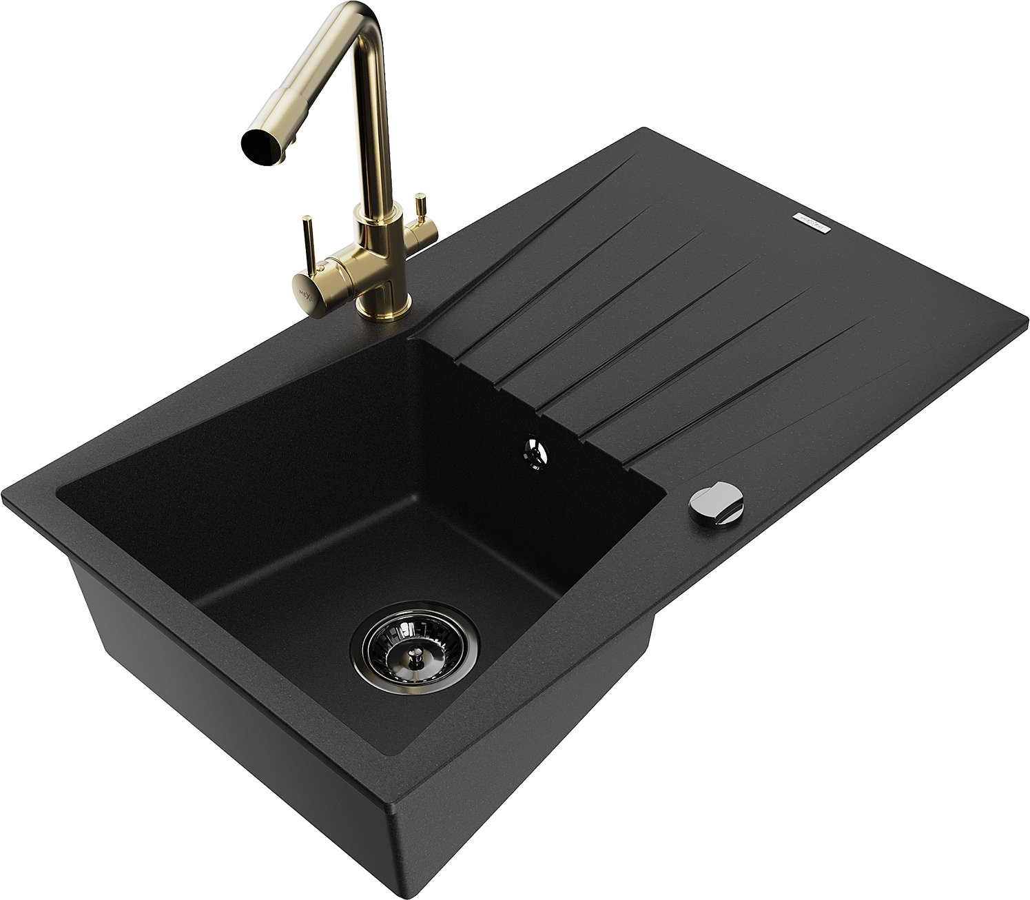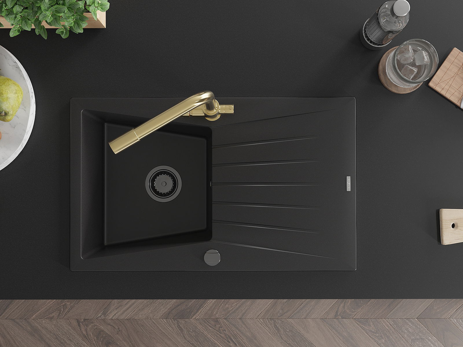 Mexen Cesar гранитна мивка с 1 отделение и отцедник и кухненски смесител Duero, черен - 6514-77-671600-50-B