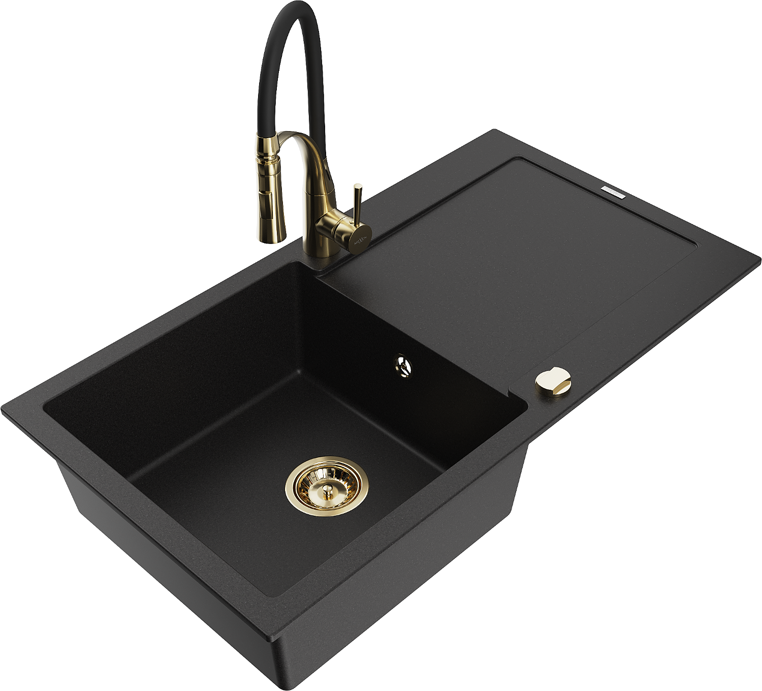 Mexen Leo гранитна кухненска мивка с 1 отделение и отцедник и кухненски смесител Aster, черен - 6501-77-73450-57-G