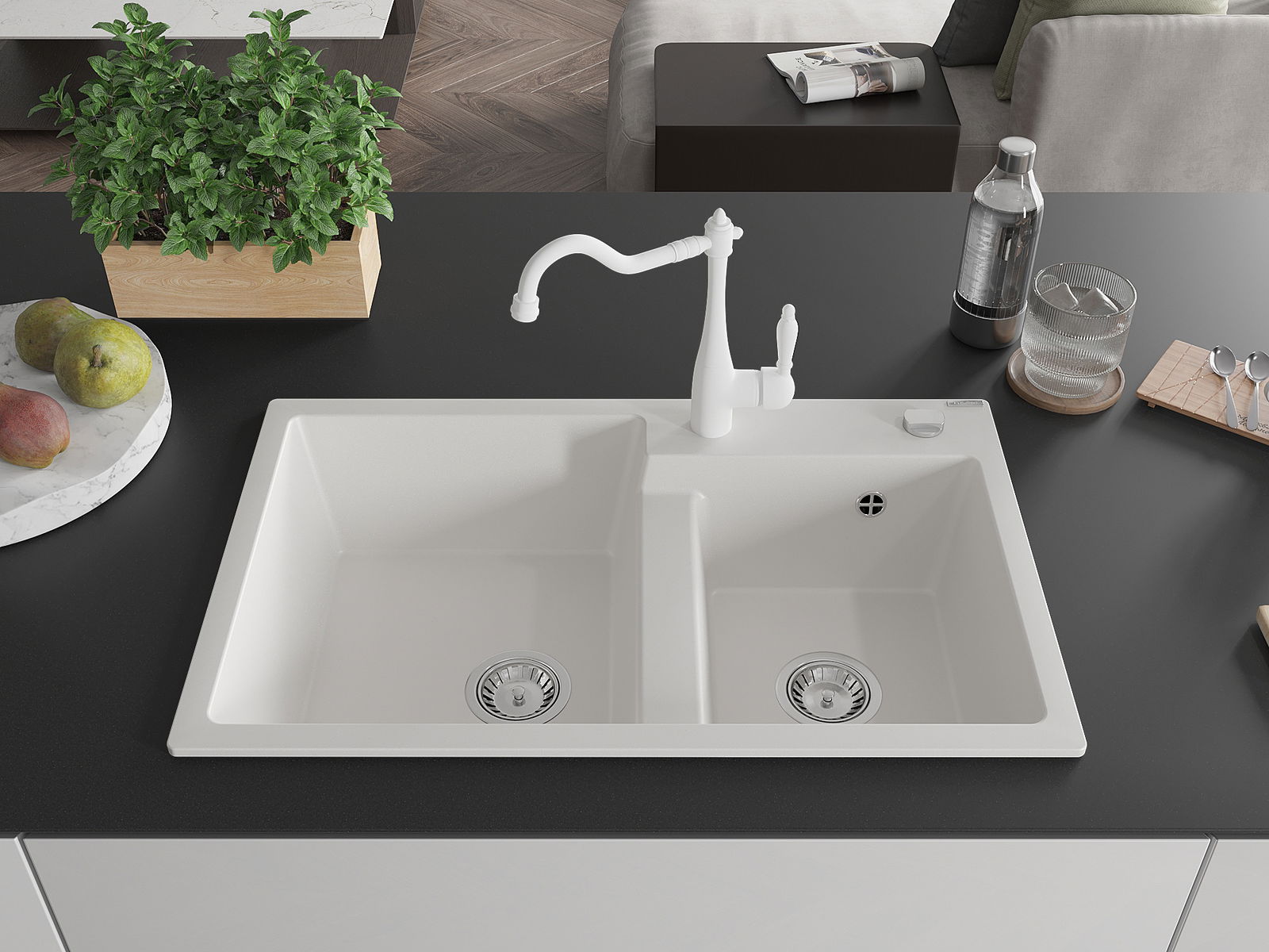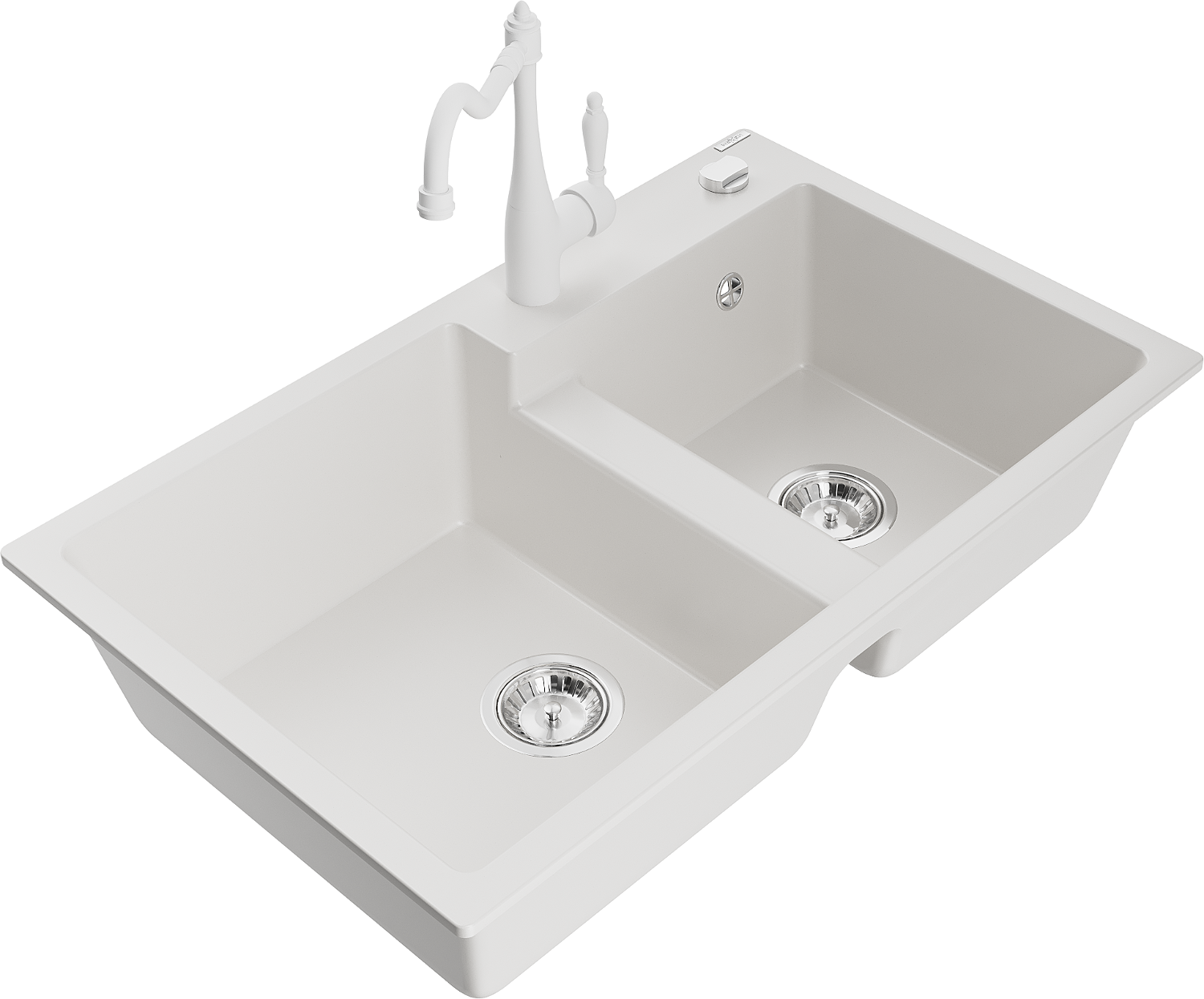 Mexen Tomas двоен гранитен кухненски мивка с кухненски смесител Carla, бял - 6516-20-670700-20