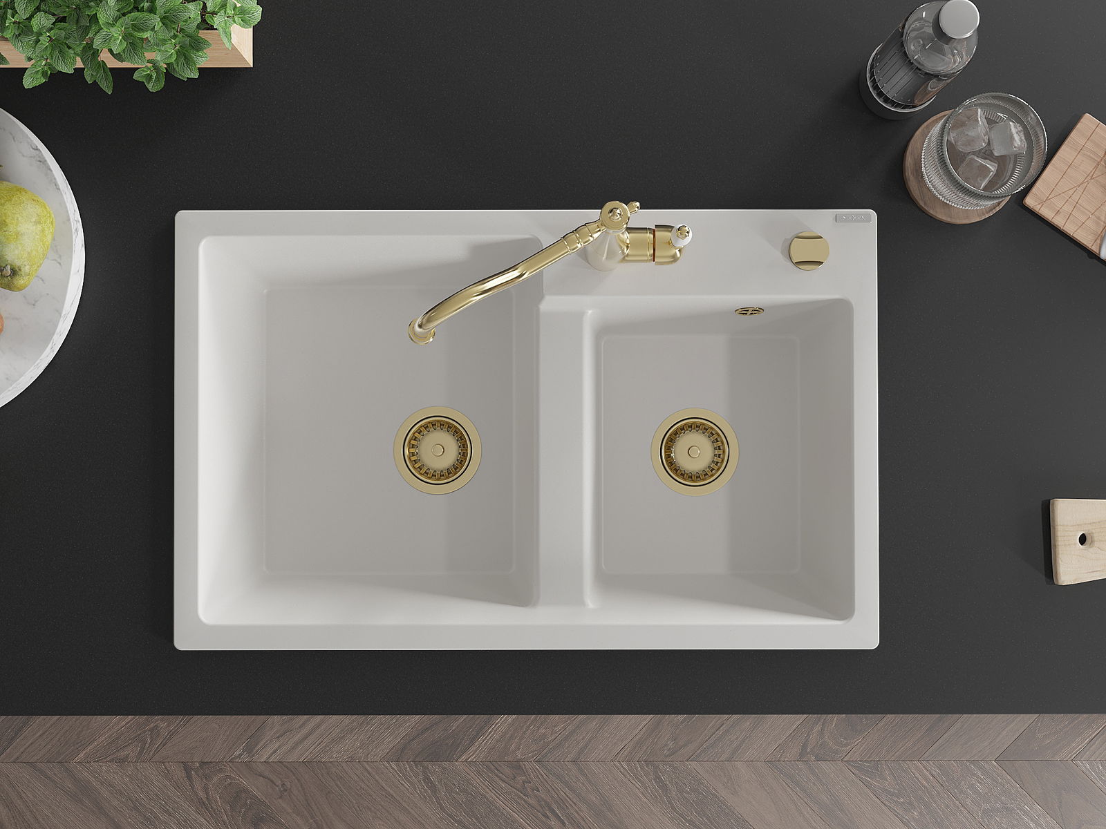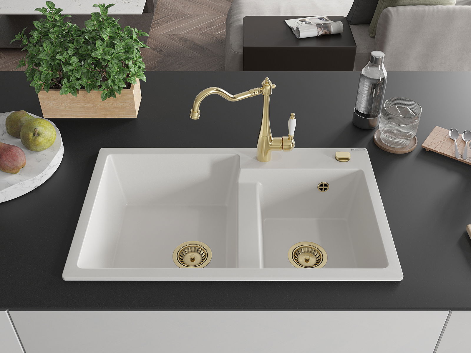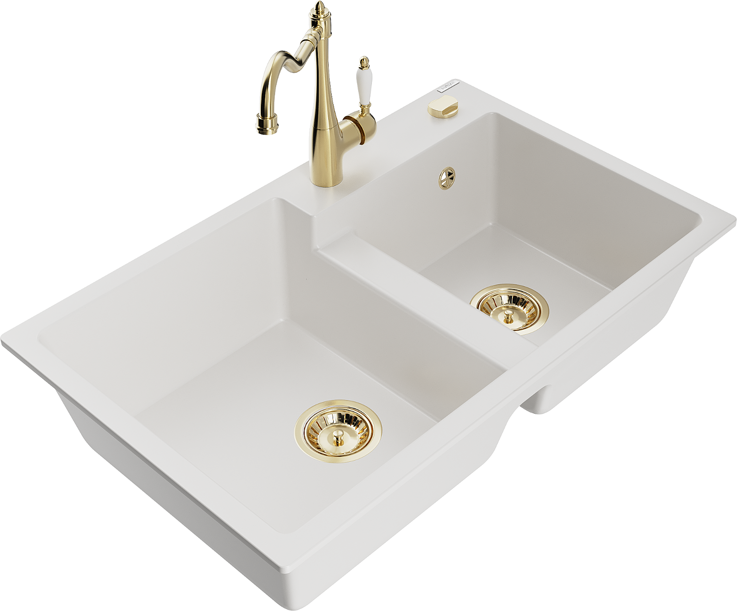 Mexen Tomas гранитна мивка с 2 камери и кухненски смесител Carla, бял - 6516-20-670700-50